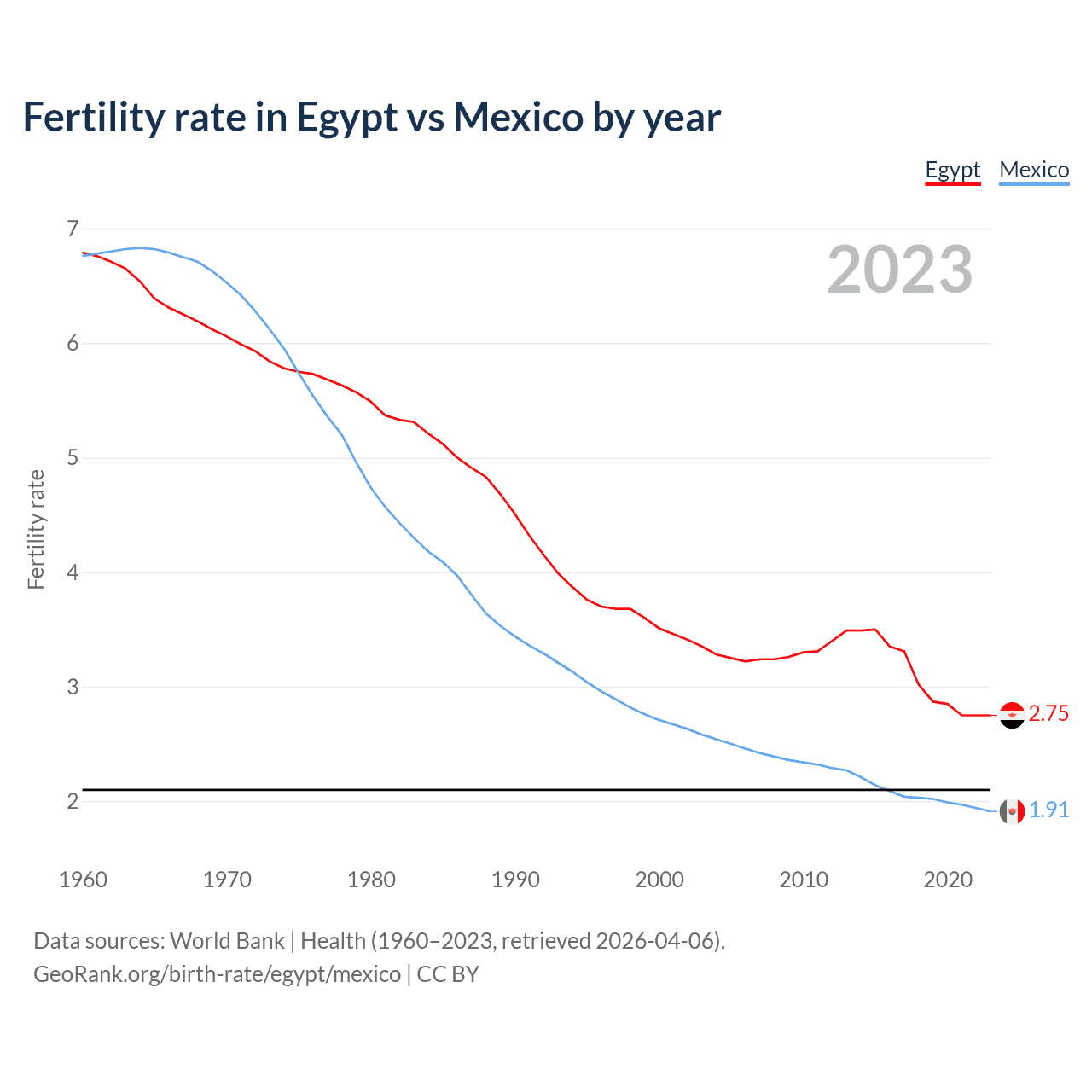 1960 vs 2023, the fertility rate has decreased by 59.5% in Egypt and by 71.8% in Mexico — in 1960, it was 6.79 and 6.76, respectively.
