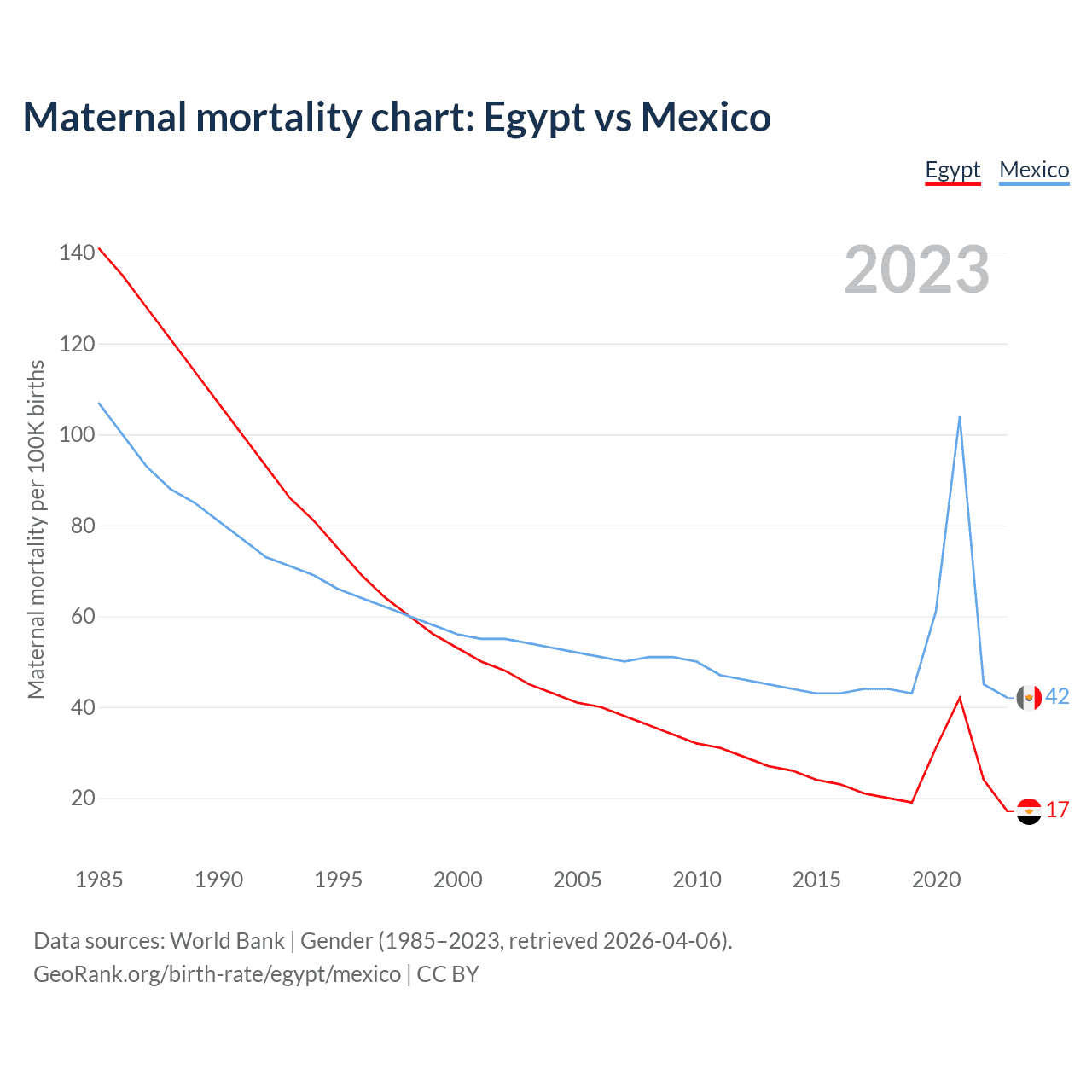 The maternal mortality rate, which is the probability of dying during childbirth or within 42 days of pregnancy termination, is 17 deaths per 100,000 live births in Egypt, compared to 42 deaths in Mexico.