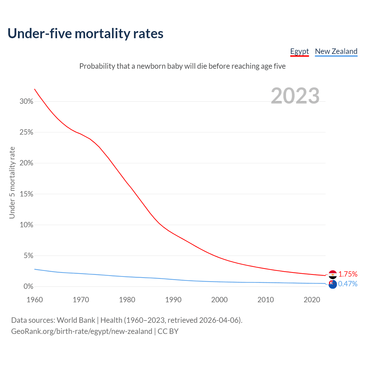 The chance that a newborn baby will die before reaching age five is 1.75% in Egypt and 0.47% in New Zealand. Above is a chart with historical data on under-five mortality rates.