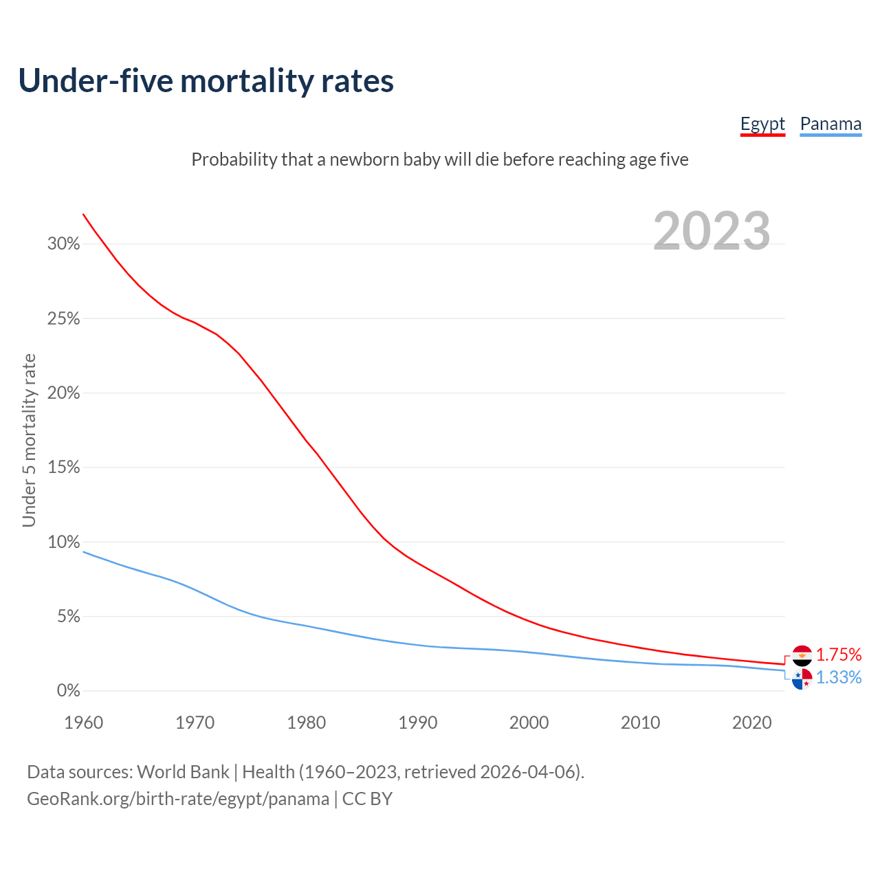 The chance that a newborn baby will die before reaching age five is 1.75% in Egypt and 1.33% in Panama. Above is a chart with historical data on under-five mortality rates.