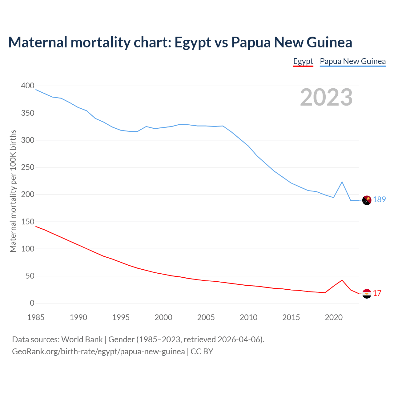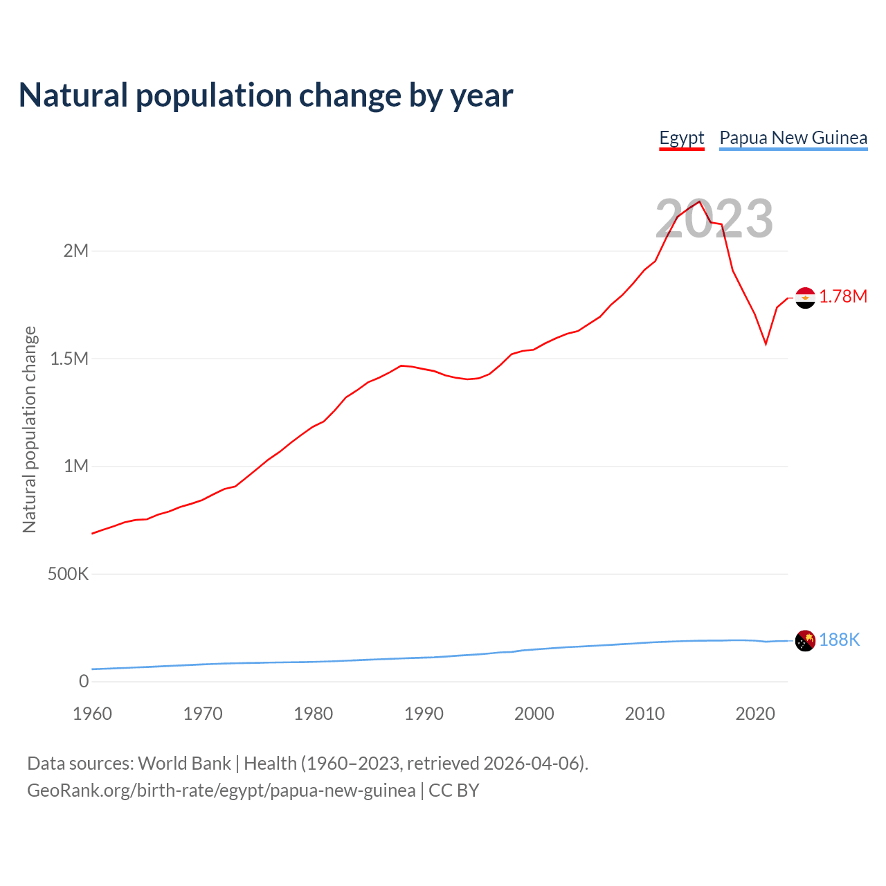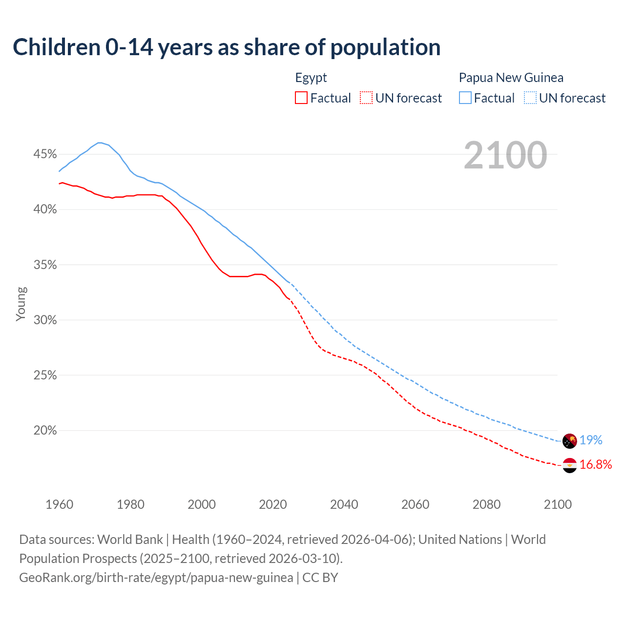 Egypt has an annual birth rate of 21 births per 1,000 people, compared to 24.6 for Papua New Guinea. The average number of children a woman is expected to have during her lifetime — the fertility rate, is 2.75 in Egypt and 3.1 in Papua New Guinea — 12.7% difference.