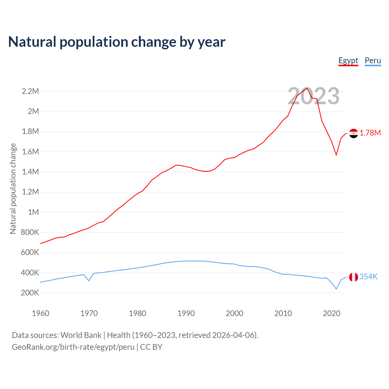 Egypt has an annual birth rate of 21 births per 1,000 people, compared to 15.9 for Peru. The average number of children a woman is expected to have during her lifetime — the fertility rate, is 2.75 in Egypt and 1.98 in Peru — 28% difference.
