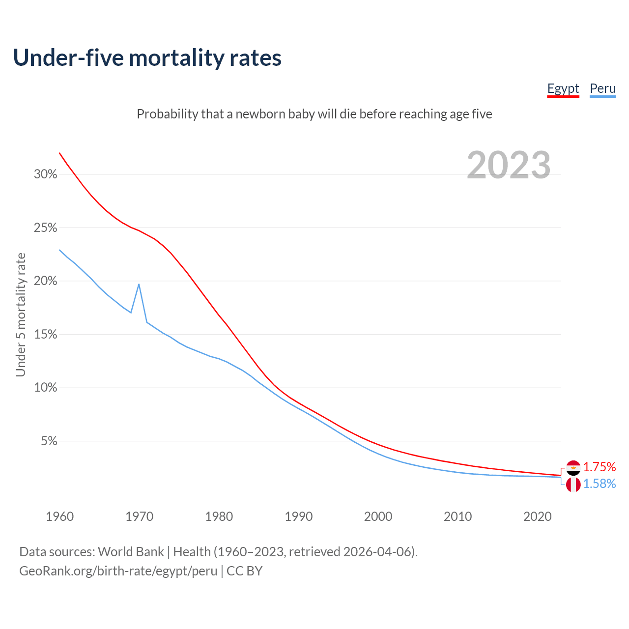 The chance that a newborn baby will die before reaching age five is 1.75% in Egypt and 1.58% in Peru. Above is a chart with historical data on under-five mortality rates.