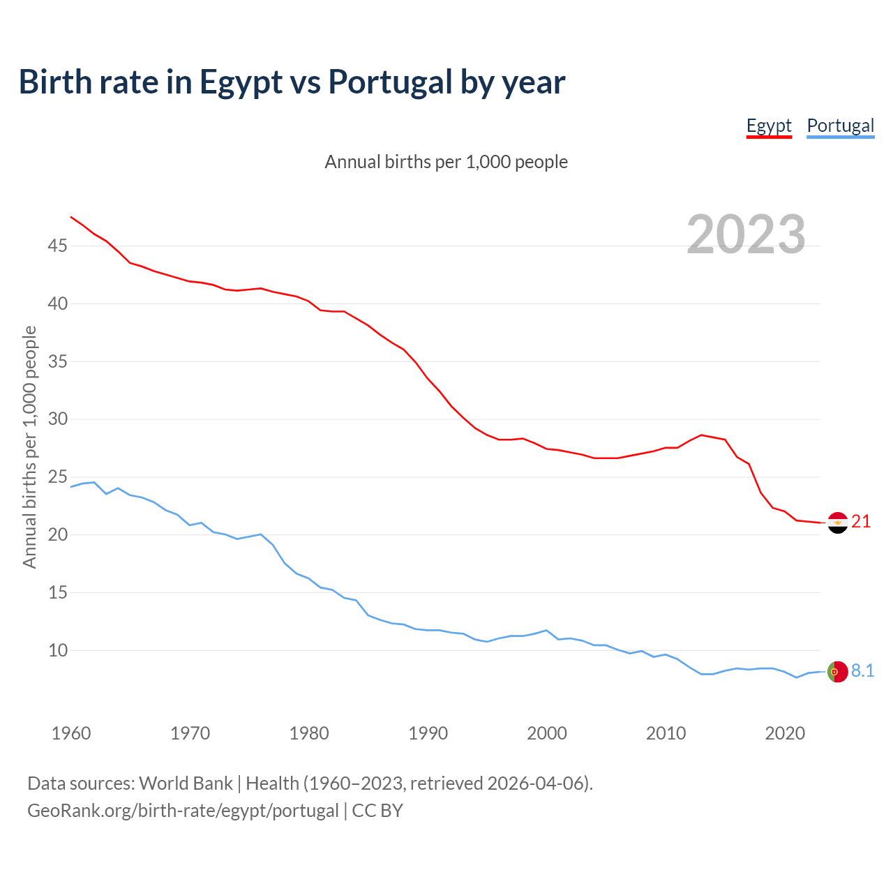 Egypt has an annual birth rate of 21 births per 1,000 people, compared to 8.1 for Portugal. The average number of children a woman is expected to have during her lifetime — the fertility rate, is 2.75 in Egypt and 1.44 in Portugal — 47.6% difference.