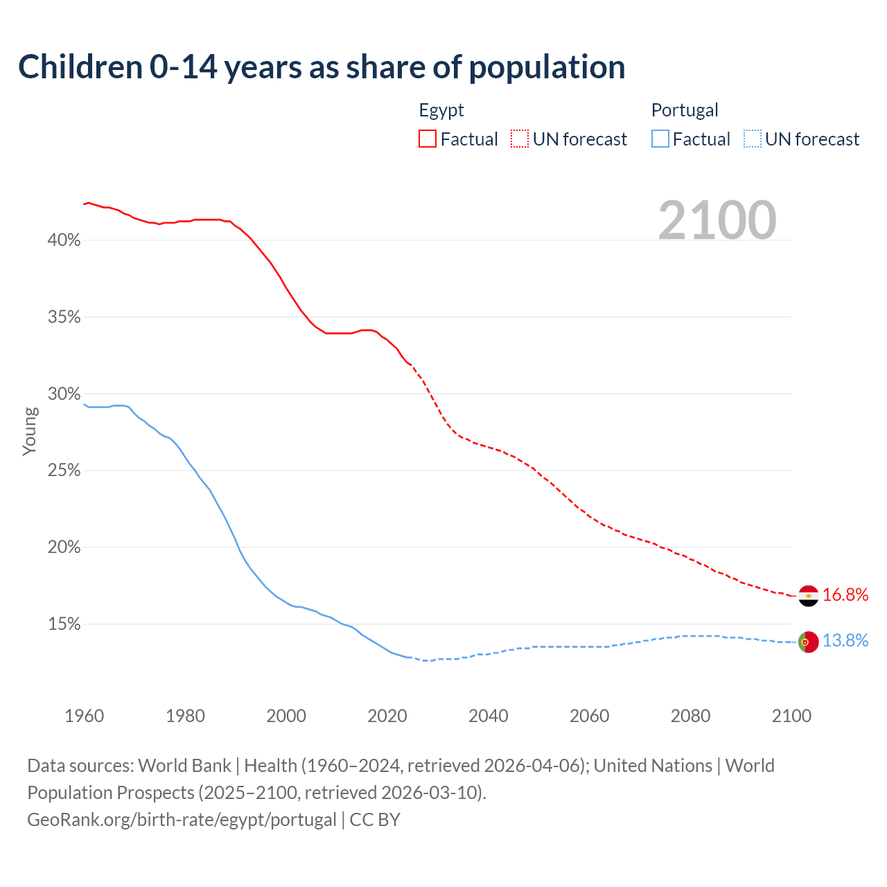 According to the latest available data on birth rates, the fertility rate in Egypt was 2.75 children per woman in 2023, compared to 1.44 in Portugal in 2023. The replacement level is considered to be 2.1 children per woman.