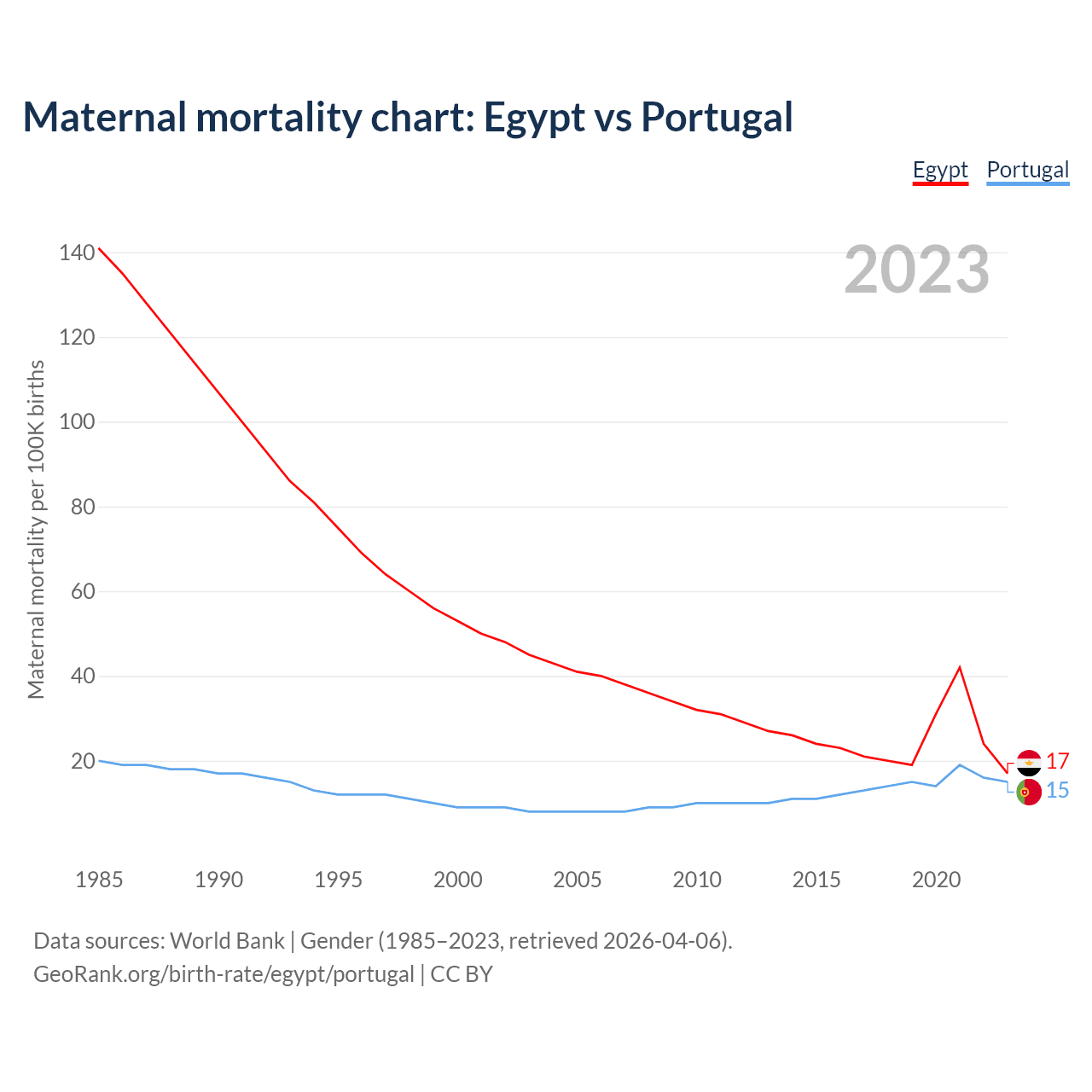 The maternal mortality rate, which is the probability of dying during childbirth or within 42 days of pregnancy termination, is 17 deaths per 100,000 live births in Egypt, compared to 15 deaths in Portugal.