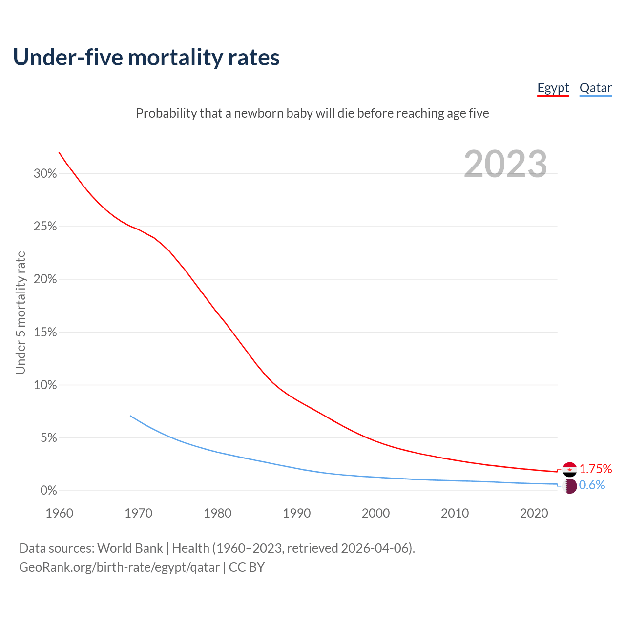 The chance that a newborn baby will die before reaching age five is 1.75% in Egypt and 0.6% in Qatar. Above is a chart with historical data on under-five mortality rates.