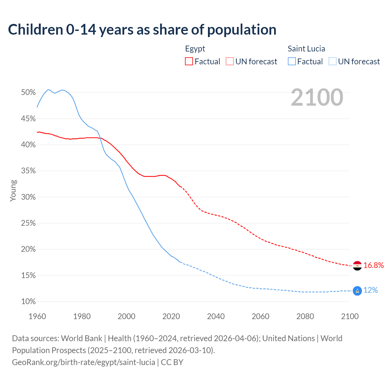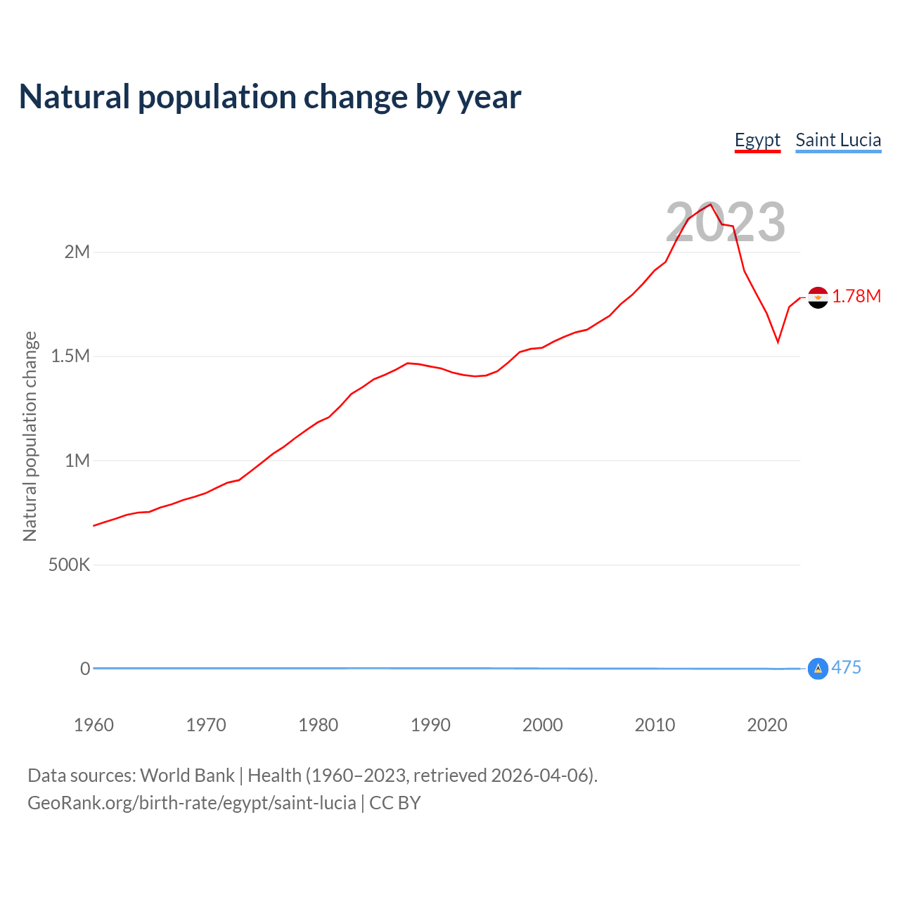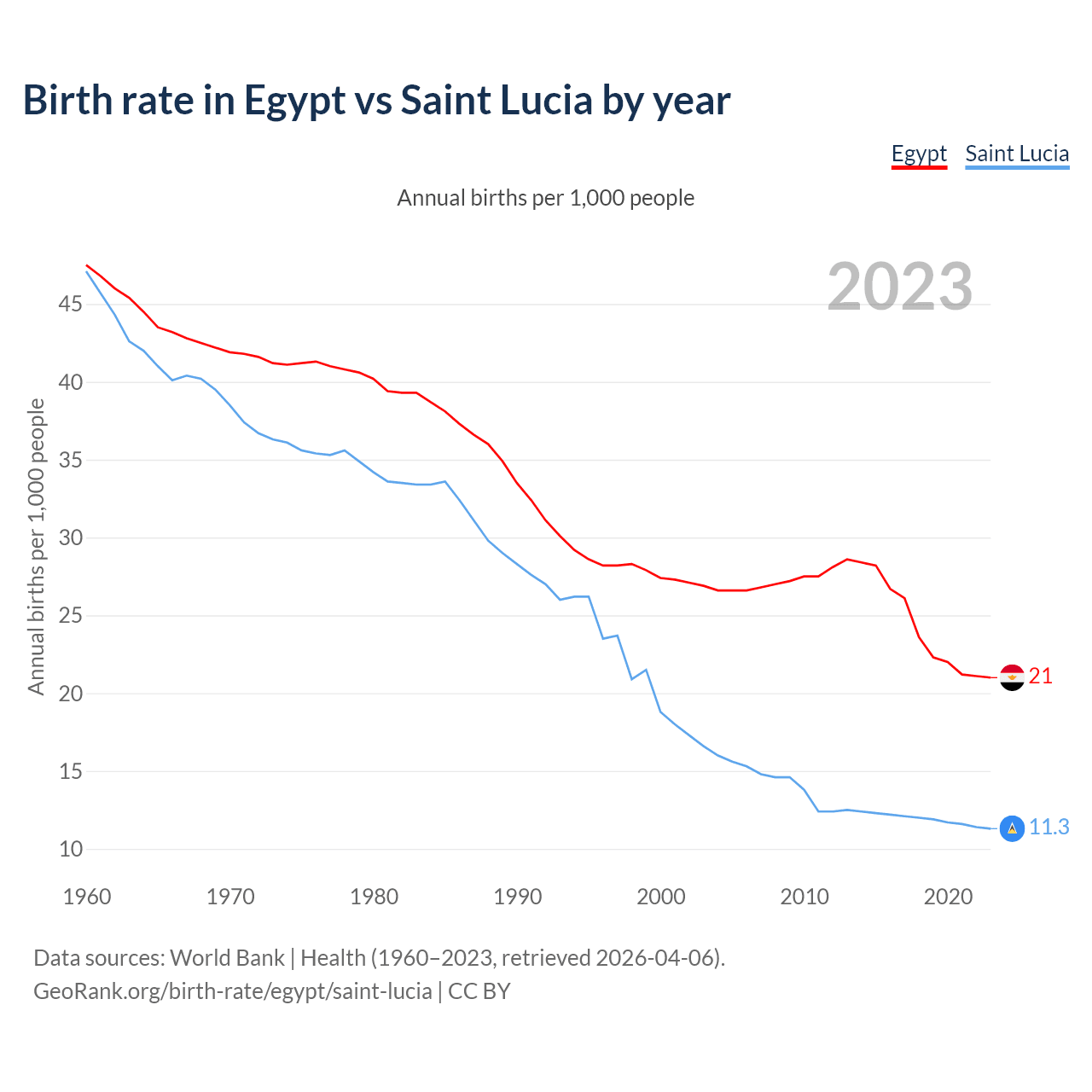 Egypt has an annual birth rate of 21 births per 1,000 people, compared to 11.3 for Saint Lucia. The average number of children a woman is expected to have during her lifetime — the fertility rate, is 2.75 in Egypt and 1.38 in Saint Lucia — 49.9% difference.