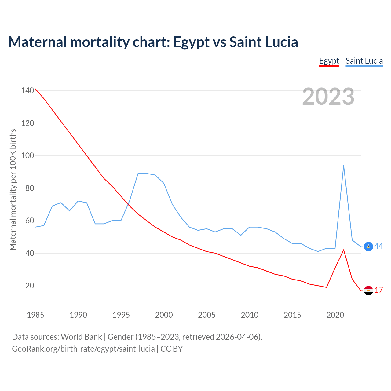 The maternal mortality rate, which is the probability of dying during childbirth or within 42 days of pregnancy termination, is 17 deaths per 100,000 live births in Egypt, compared to 44 deaths in Saint Lucia.