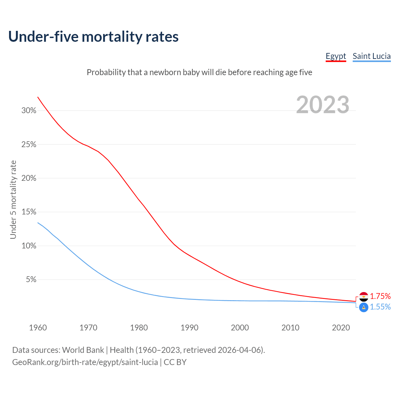 The chance that a newborn baby will die before reaching age five is 1.75% in Egypt and 1.55% in Saint Lucia. Above is a chart with historical data on under-five mortality rates.