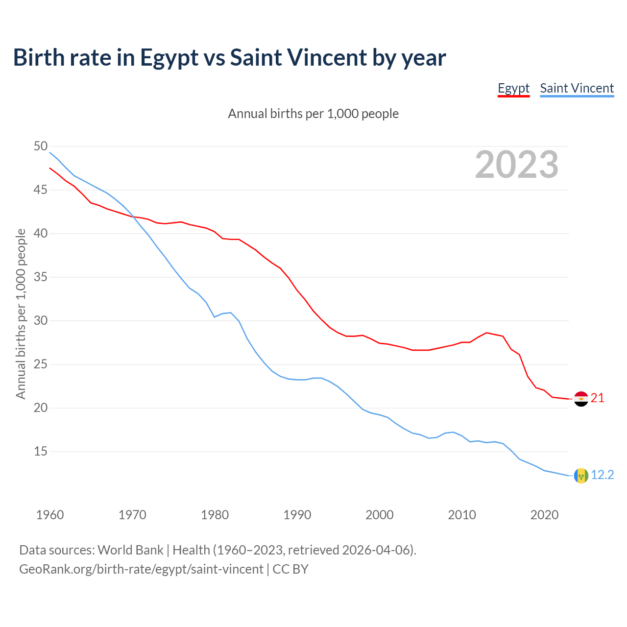 Egypt has an annual birth rate of 21 births per 1,000 people, compared to 12.2 for Saint Vincent. The average number of children a woman is expected to have during her lifetime — the fertility rate, is 2.75 in Egypt and 1.78 in Saint Vincent — 35.5% difference.
