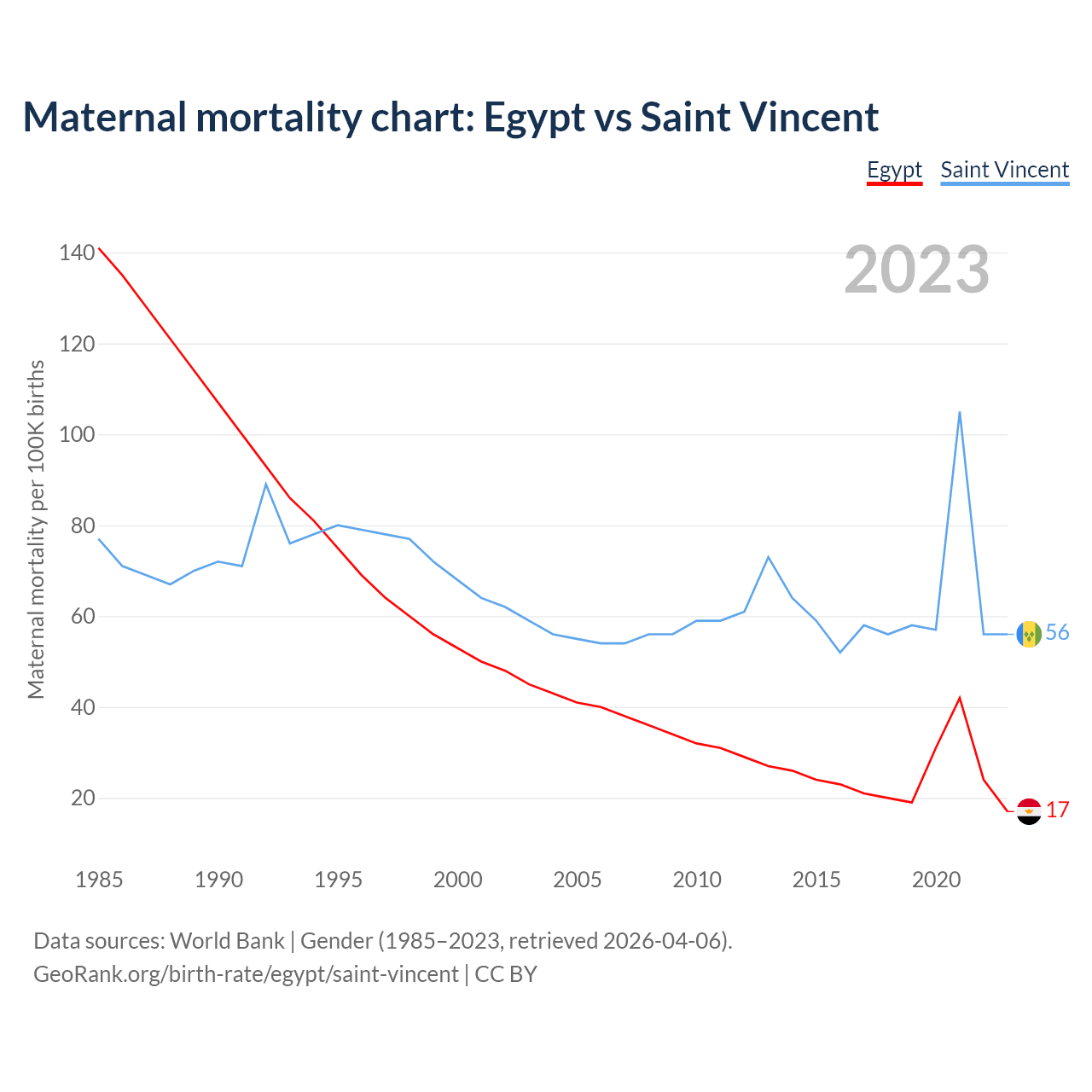 The maternal mortality rate, which is the probability of dying during childbirth or within 42 days of pregnancy termination, is 17 deaths per 100,000 live births in Egypt, compared to 56 deaths in Saint Vincent.