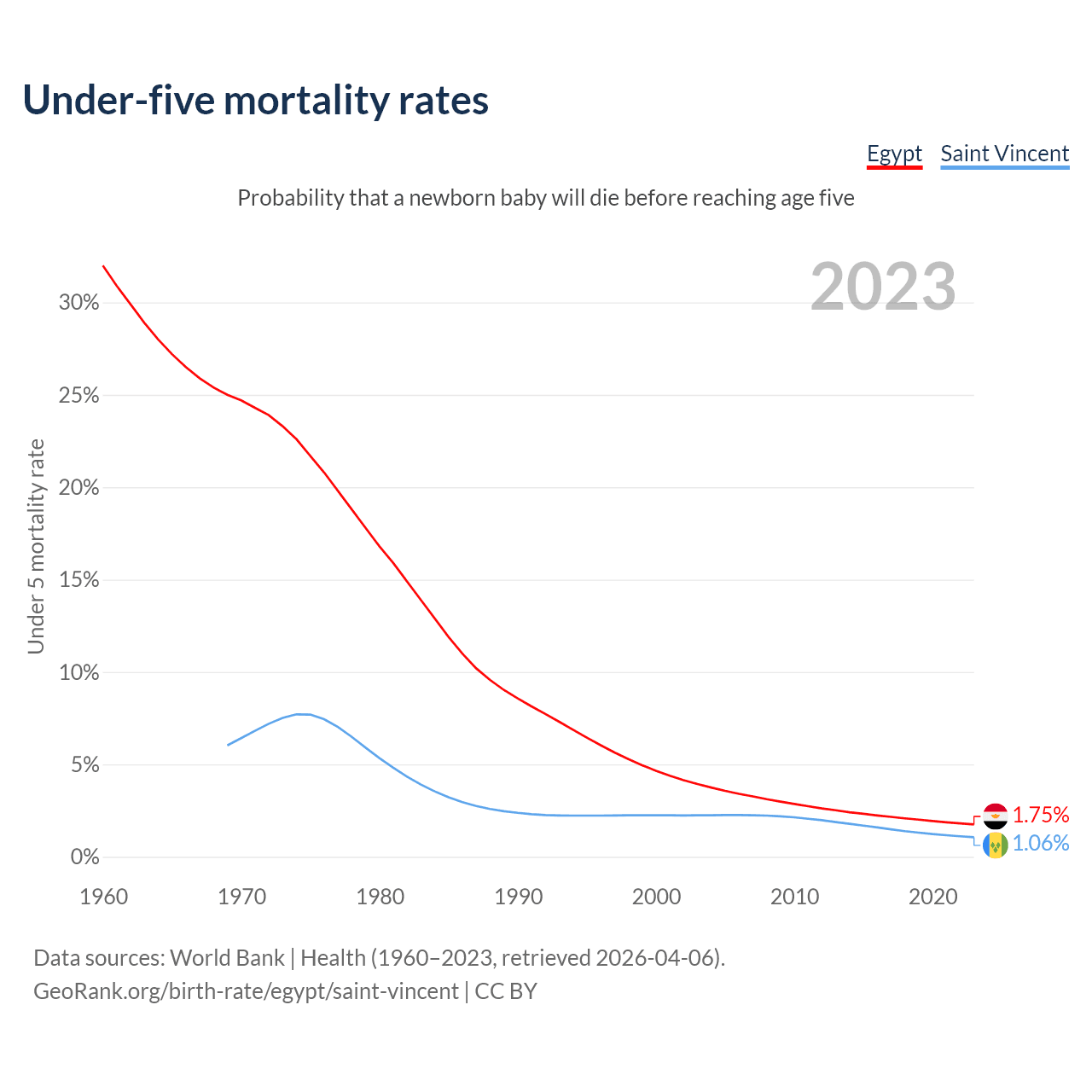 The chance that a newborn baby will die before reaching age five is 1.75% in Egypt and 1.06% in Saint Vincent. Above is a chart with historical data on under-five mortality rates.