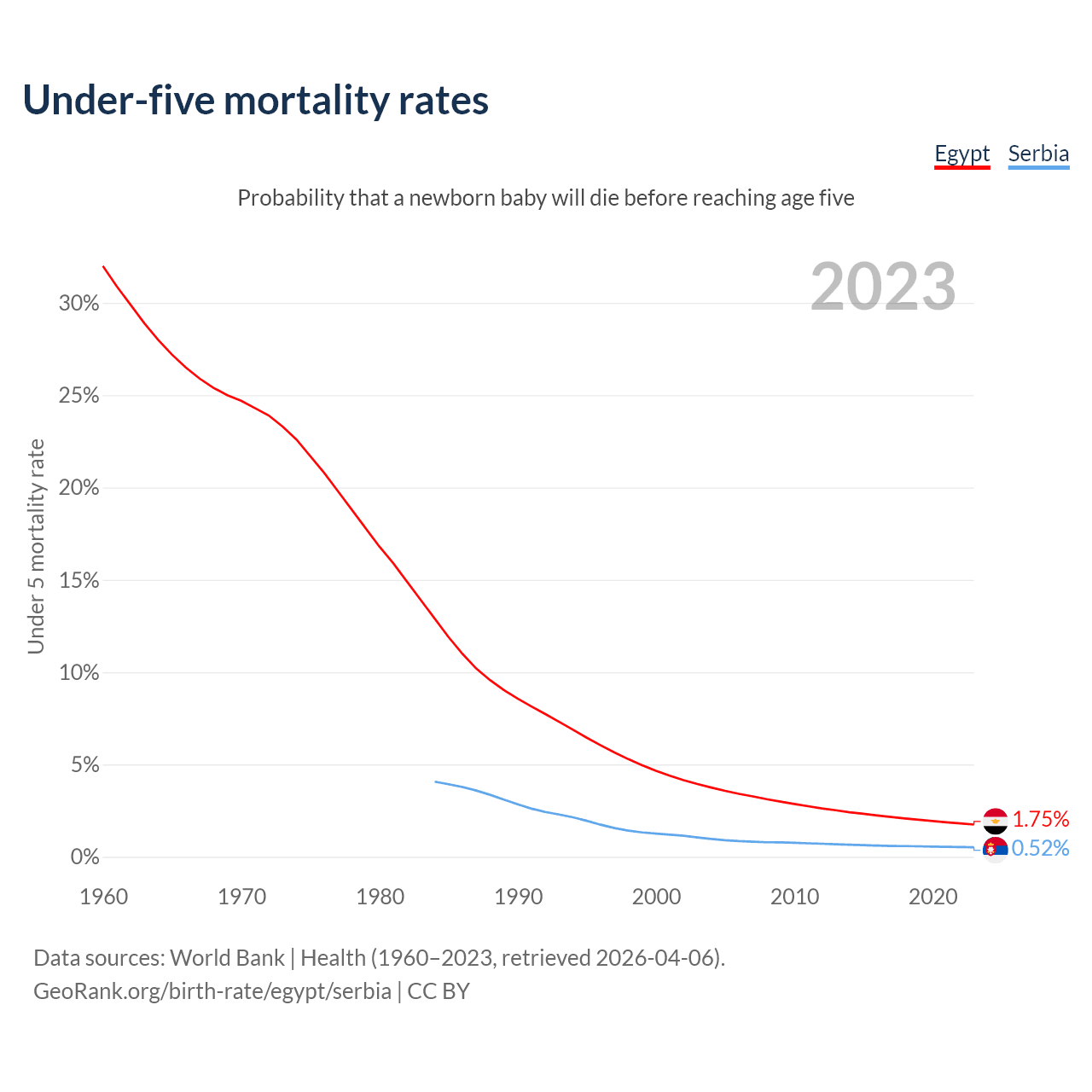 The chance that a newborn baby will die before reaching age five is 1.75% in Egypt and 0.52% in Serbia. Above is a chart with historical data on under-five mortality rates.