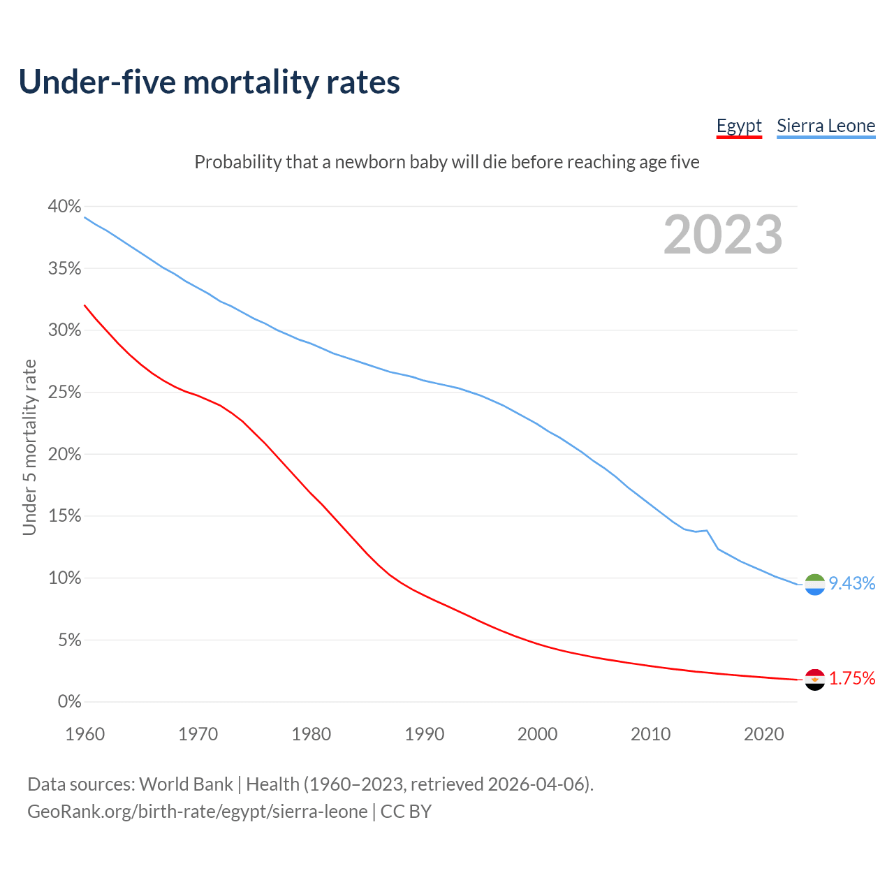 The chance that a newborn baby will die before reaching age five is 1.75% in Egypt and 9.43% in Sierra Leone. Above is a chart with historical data on under-five mortality rates.