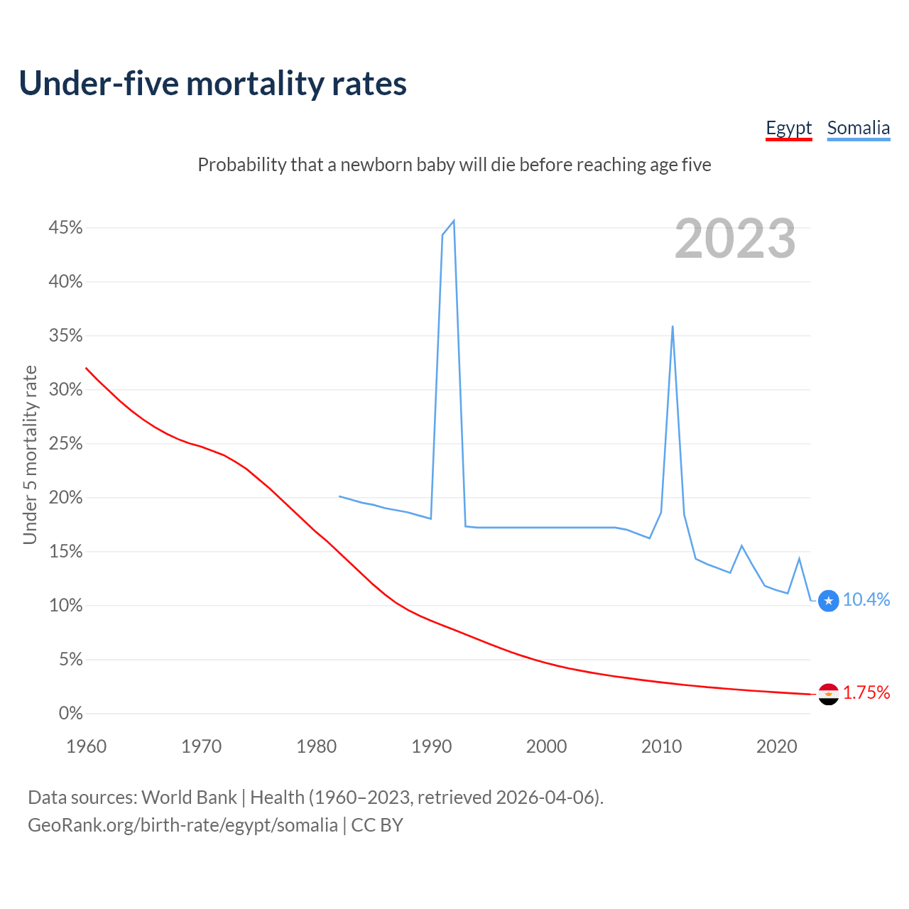 The chance that a newborn baby will die before reaching age five is 1.75% in Egypt and 10.4% in Somalia. Above is a chart with historical data on under-five mortality rates.