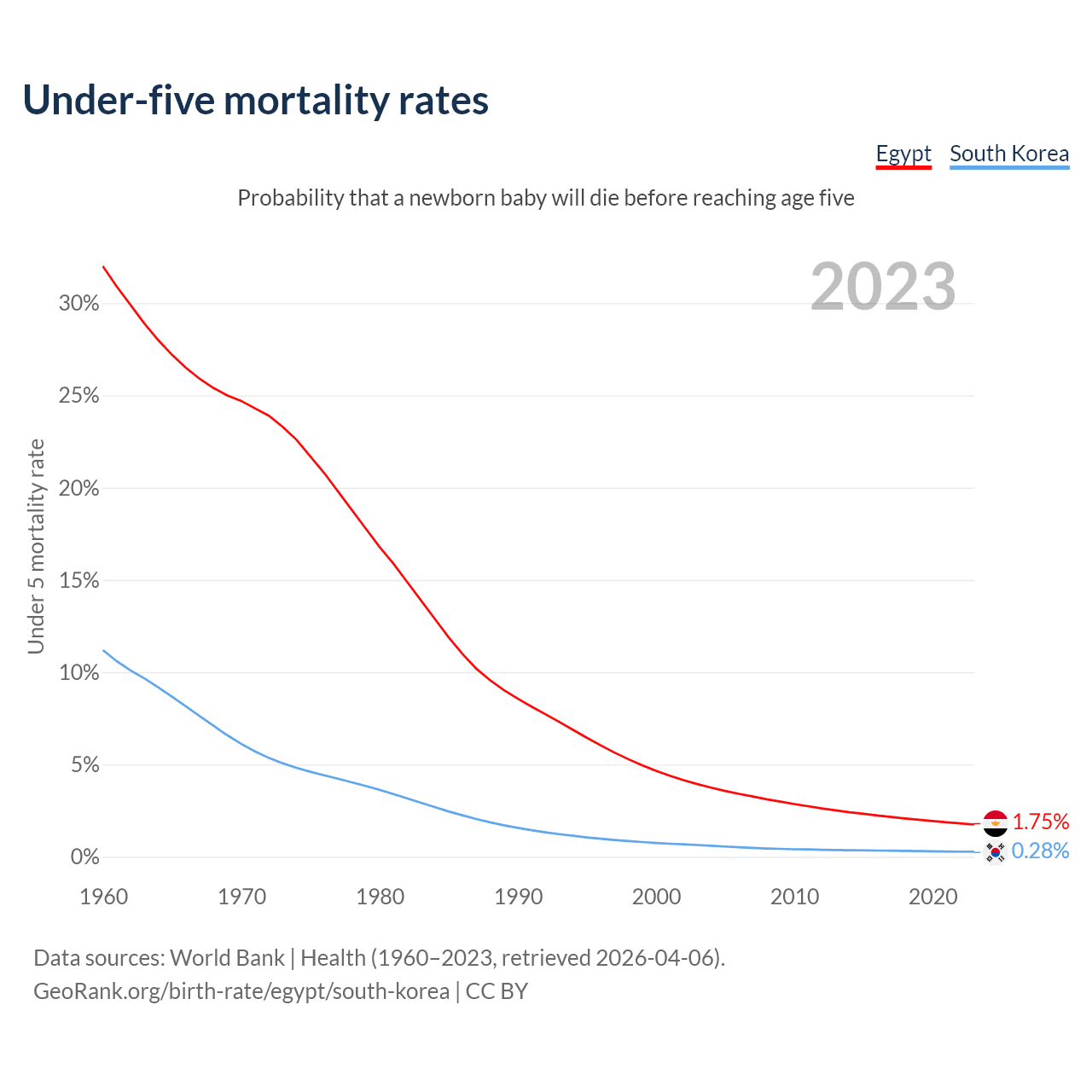 The chance that a newborn baby will die before reaching age five is 1.75% in Egypt and 0.28% in South Korea. Above is a chart with historical data on under-five mortality rates.