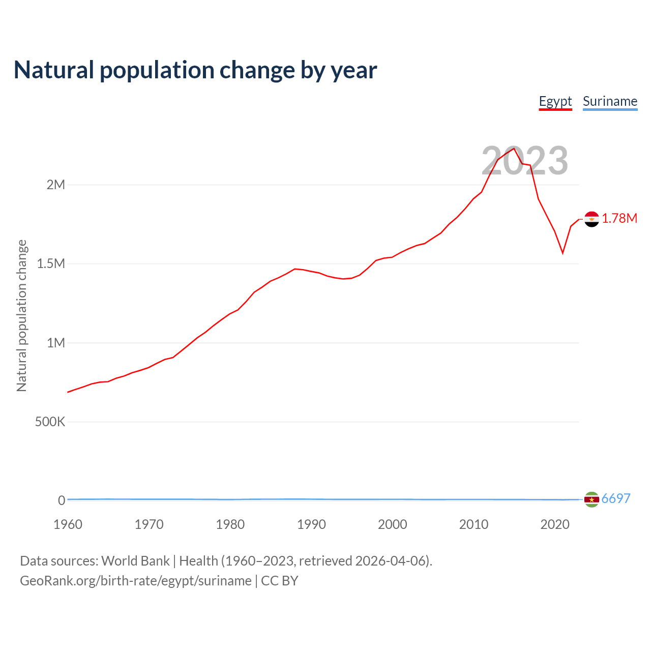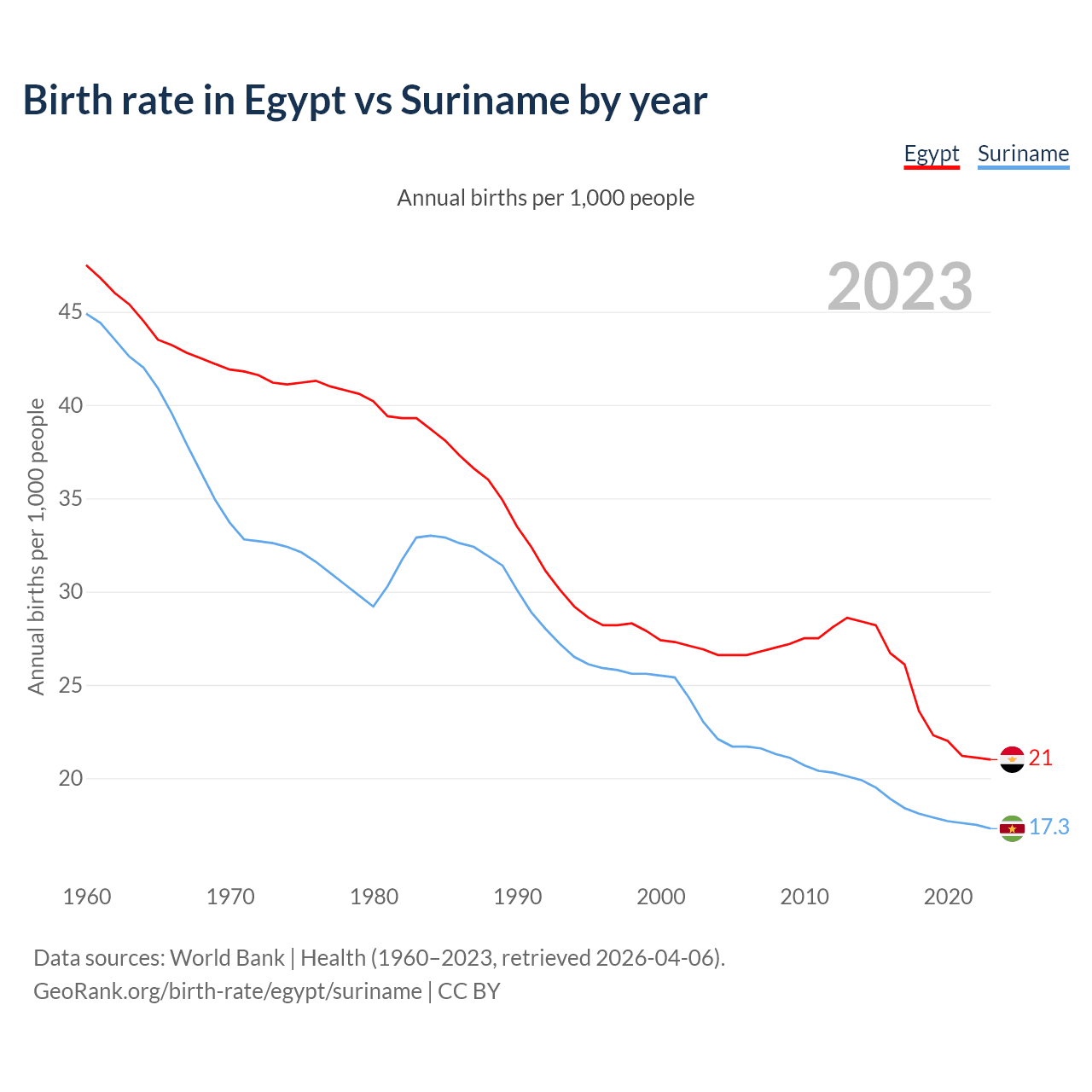 Egypt has an annual birth rate of 21 births per 1,000 people, compared to 17.3 for Suriname. The average number of children a woman is expected to have during her lifetime — the fertility rate, is 2.75 in Egypt and 2.25 in Suriname — 18.2% difference.