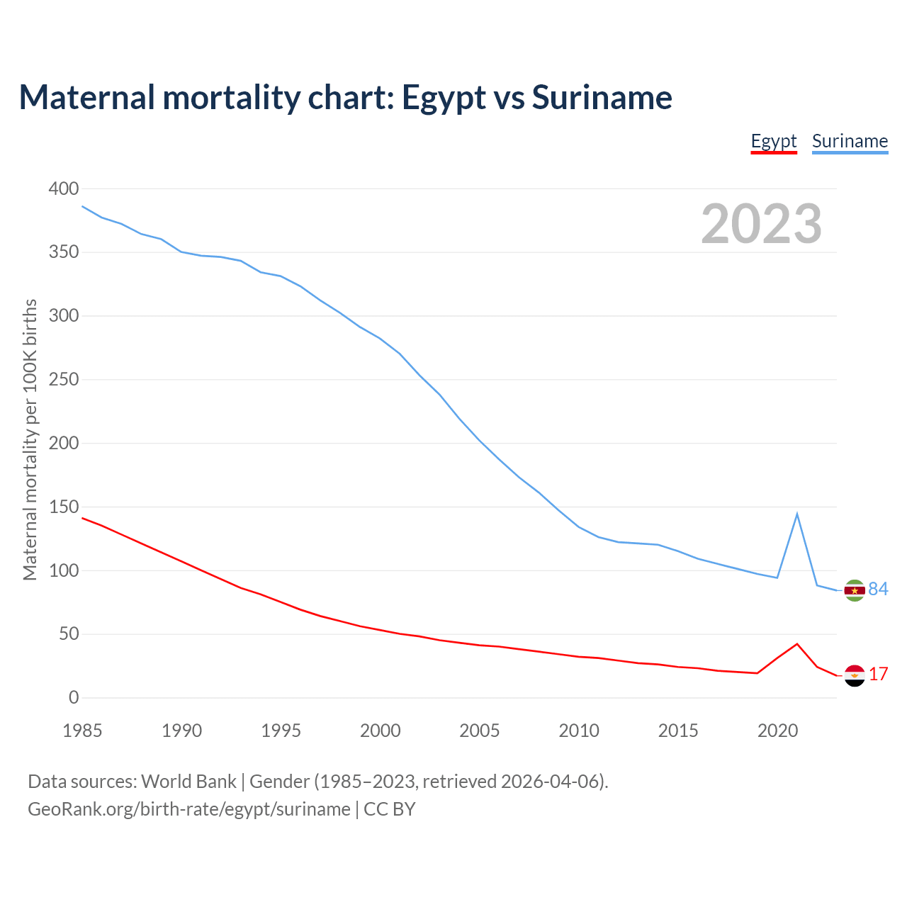 The maternal mortality rate, which is the probability of dying during childbirth or within 42 days of pregnancy termination, is 17 deaths per 100,000 live births in Egypt, compared to 84 deaths in Suriname.
