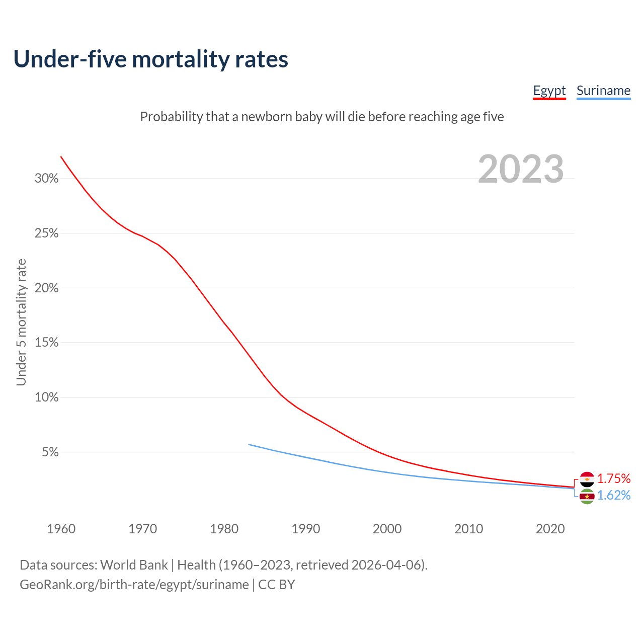 The chance that a newborn baby will die before reaching age five is 1.75% in Egypt and 1.62% in Suriname. Above is a chart with historical data on under-five mortality rates.