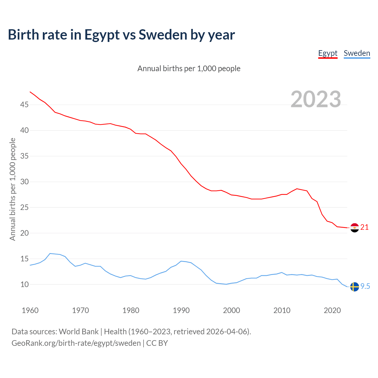 Egypt has an annual birth rate of 21 births per 1,000 people, compared to 9.5 for Sweden. The average number of children a woman is expected to have during her lifetime — the fertility rate, is 2.75 in Egypt and 1.45 in Sweden — 47.3% difference.