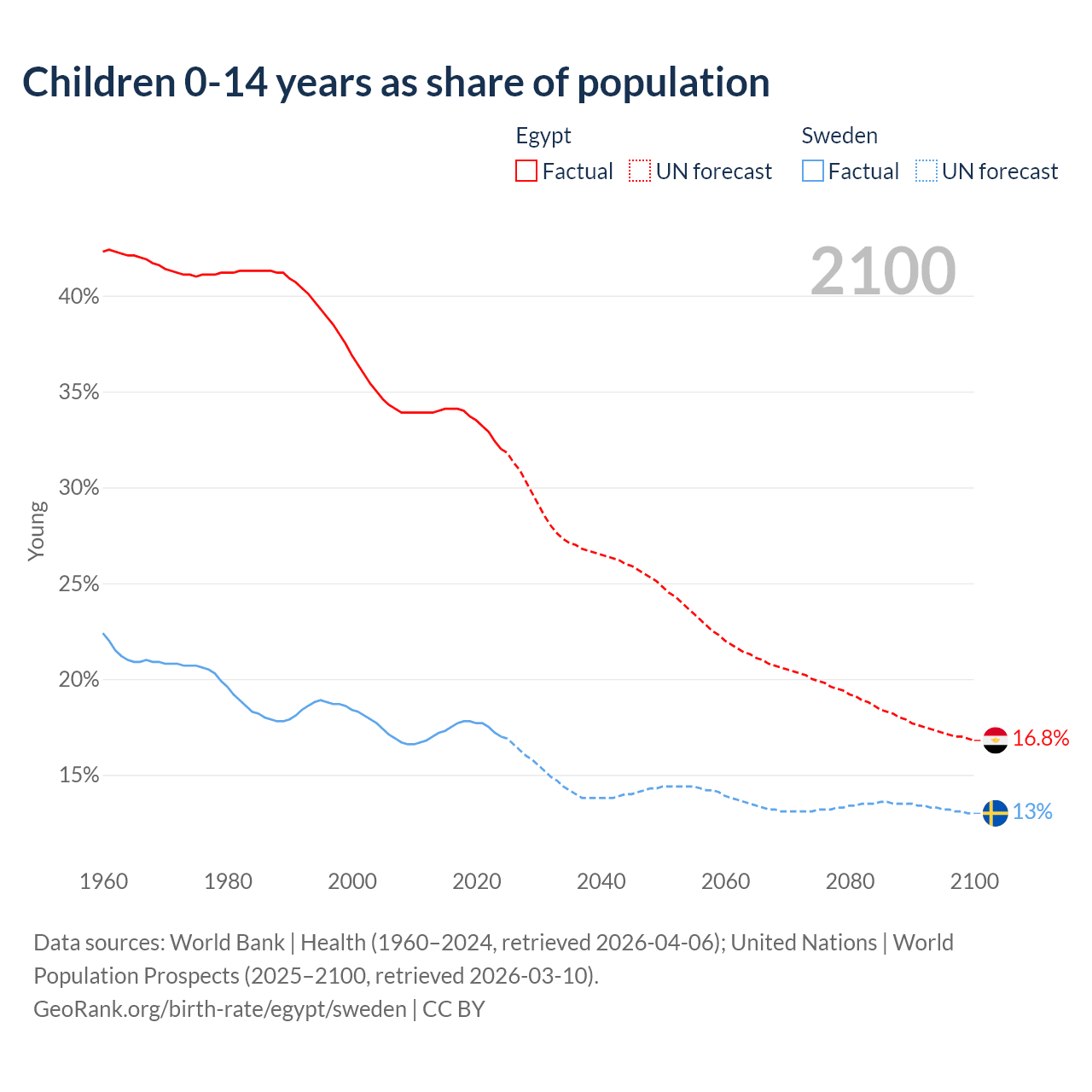 According to the latest available data on birth rates, the fertility rate in Egypt was 2.75 children per woman in 2023, compared to 1.45 in Sweden in 2023. The replacement level is considered to be 2.1 children per woman.