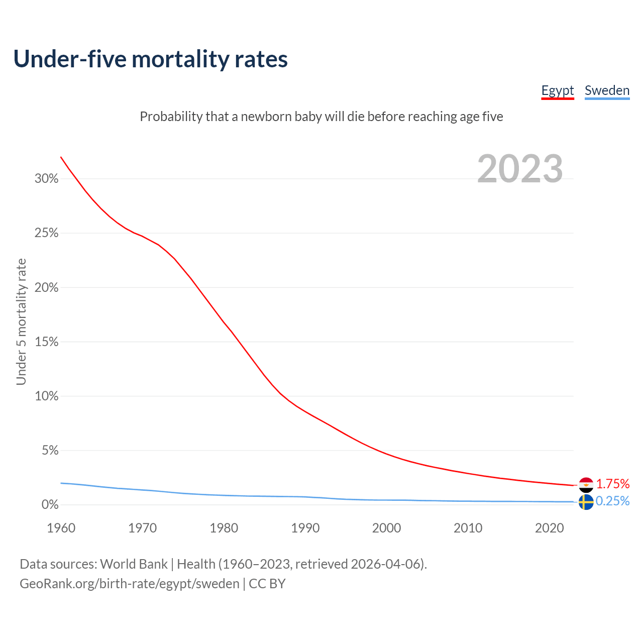The chance that a newborn baby will die before reaching age five is 1.75% in Egypt and 0.25% in Sweden. Above is a chart with historical data on under-five mortality rates.