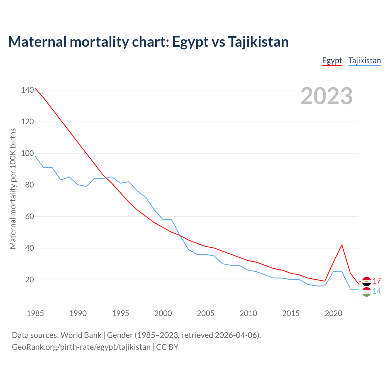 The maternal mortality rate, which is the probability of dying during childbirth or within 42 days of pregnancy termination, is 17 deaths per 100,000 live births in Egypt, compared to 14 deaths in Tajikistan.