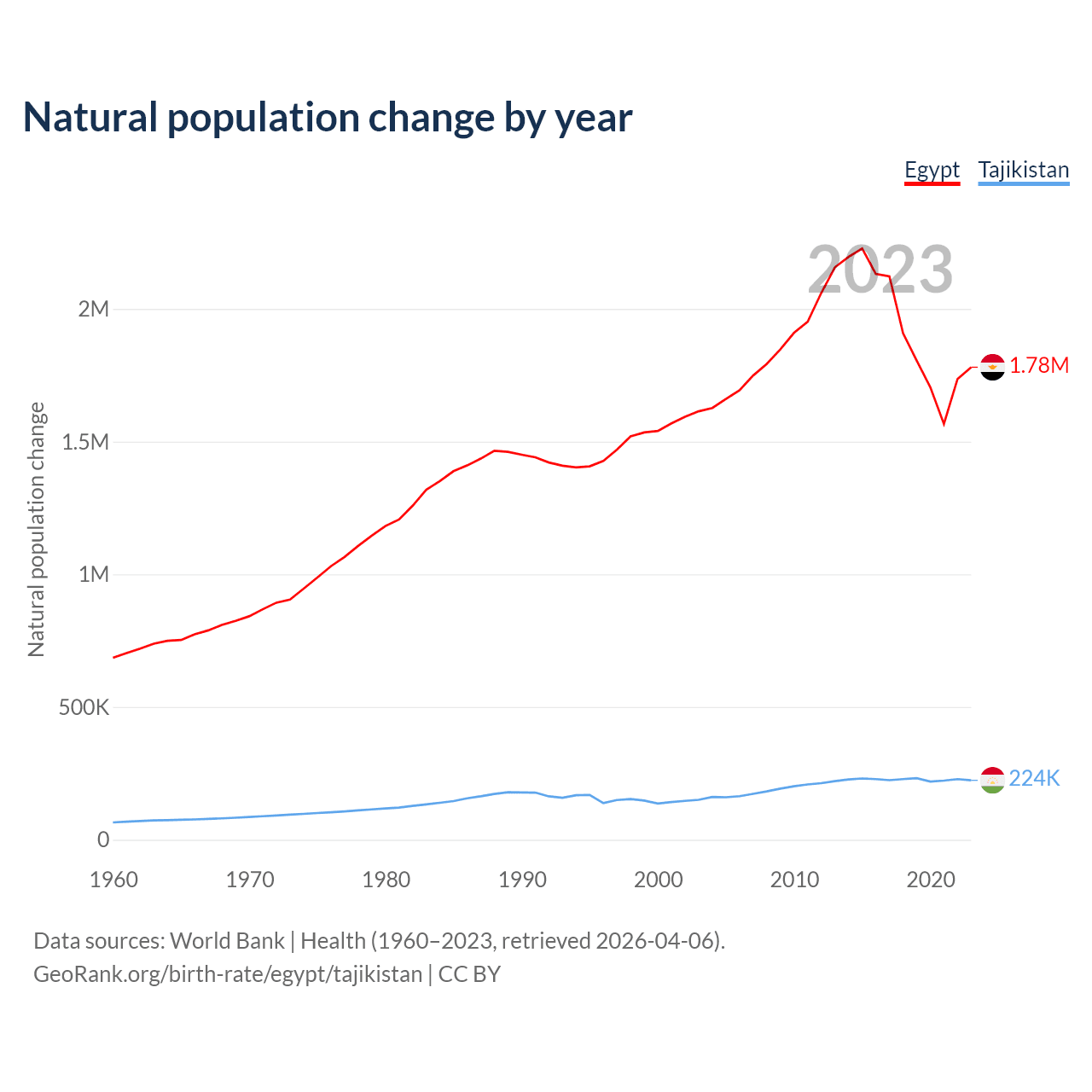 Egypt has an annual birth rate of 21 births per 1,000 people, compared to 26.1 for Tajikistan. The average number of children a woman is expected to have during her lifetime — the fertility rate, is 2.75 in Egypt and 3.07 in Tajikistan — 11.7% difference.