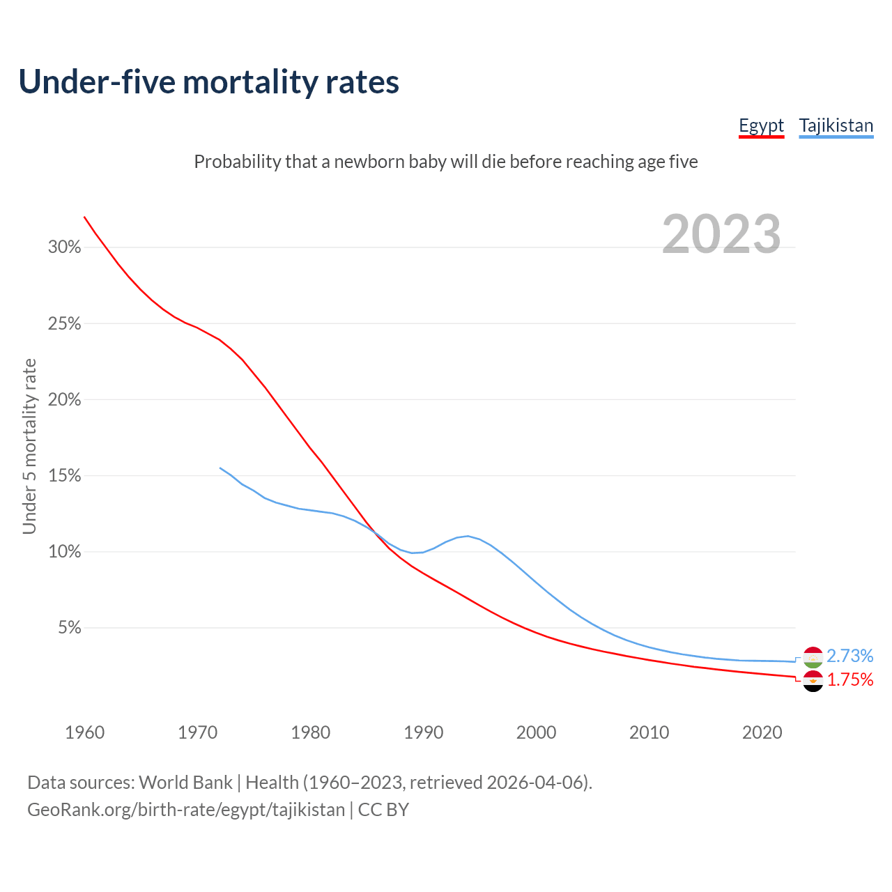 The chance that a newborn baby will die before reaching age five is 1.75% in Egypt and 2.73% in Tajikistan. Above is a chart with historical data on under-five mortality rates.