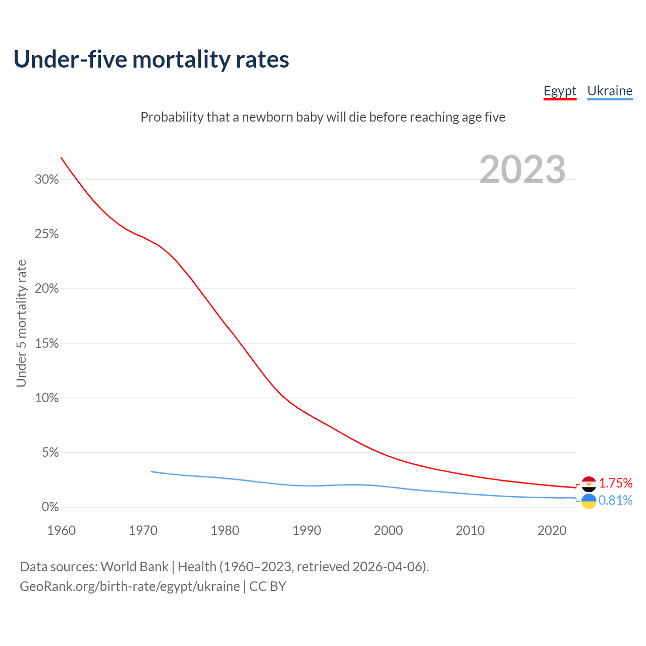 The chance that a newborn baby will die before reaching age five is 1.75% in Egypt and 0.81% in Ukraine. Above is a chart with historical data on under-five mortality rates.