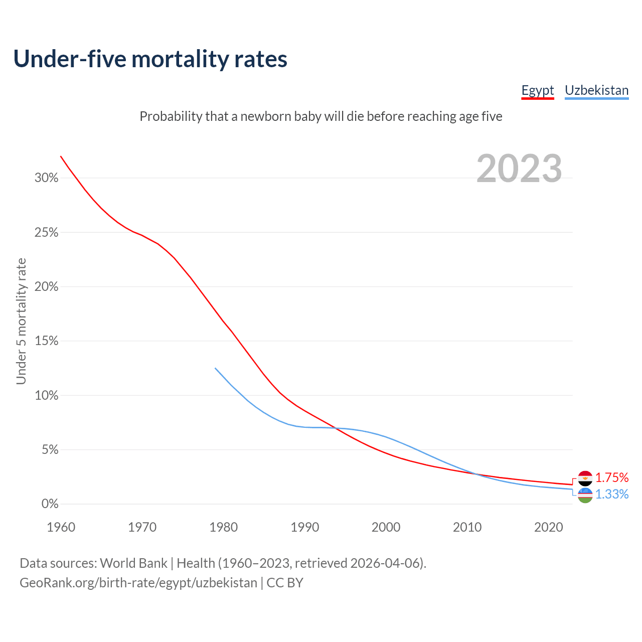 The chance that a newborn baby will die before reaching age five is 1.75% in Egypt and 1.33% in Uzbekistan. Above is a chart with historical data on under-five mortality rates.