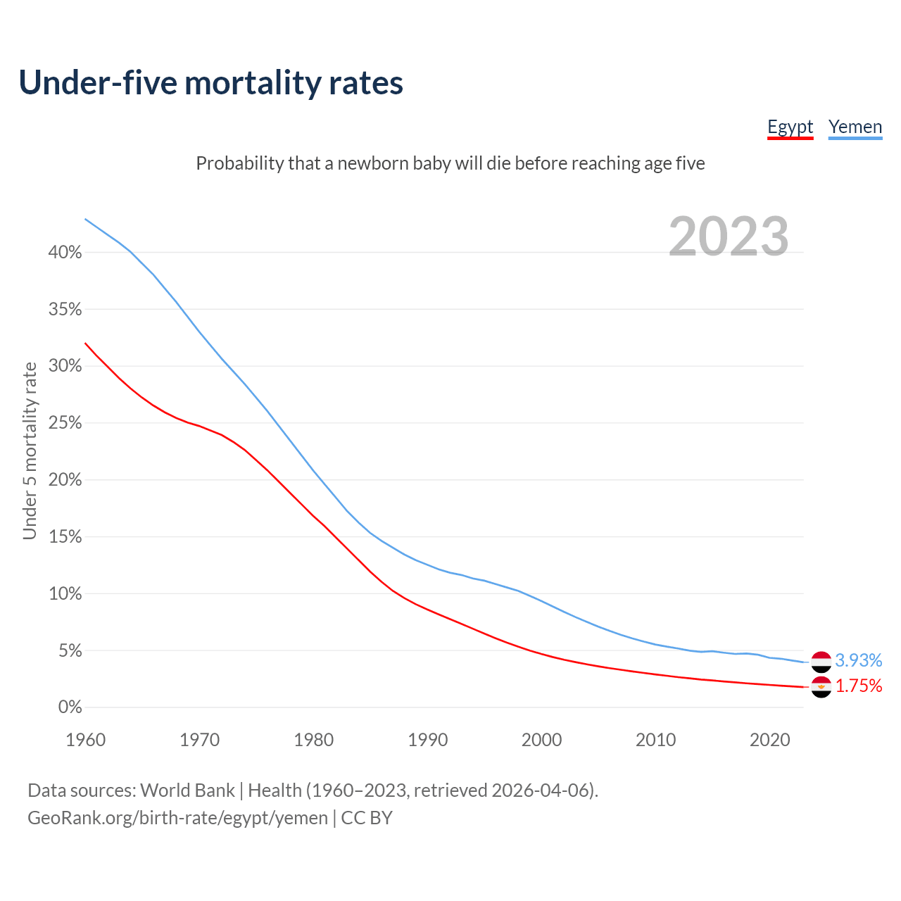 The chance that a newborn baby will die before reaching age five is 1.75% in Egypt and 3.93% in Yemen. Above is a chart with historical data on under-five mortality rates.