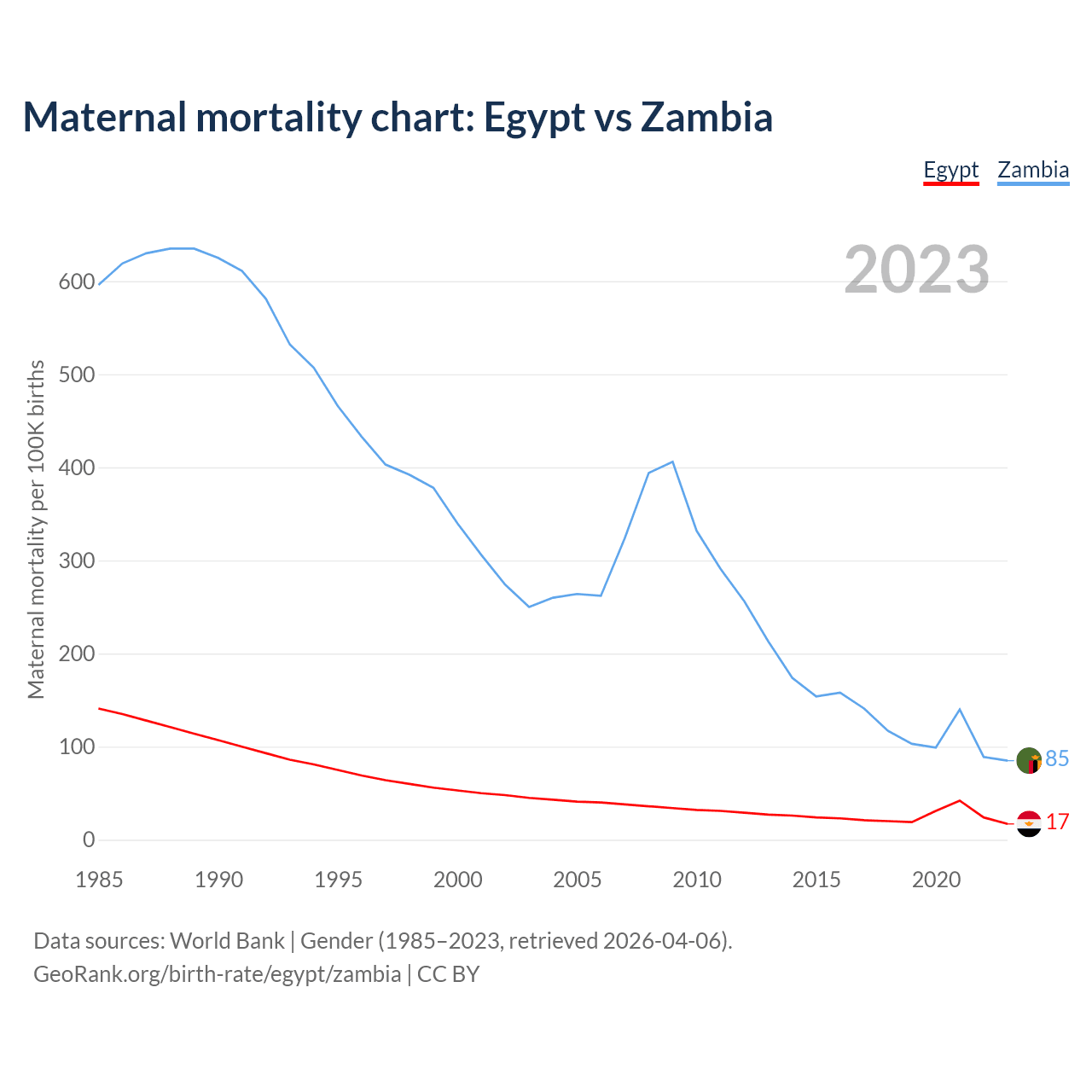 The maternal mortality rate, which is the probability of dying during childbirth or within 42 days of pregnancy termination, is 17 deaths per 100,000 live births in Egypt, compared to 85 deaths in Zambia.