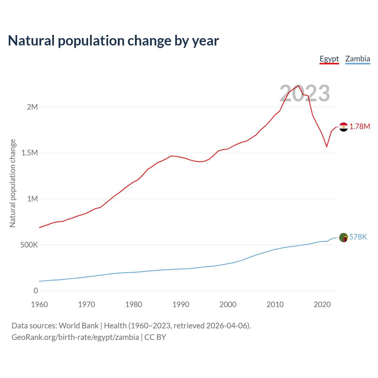Egypt has an annual birth rate of 21 births per 1,000 people, compared to 33.1 for Zambia. The average number of children a woman is expected to have during her lifetime — the fertility rate, is 2.75 in Egypt and 4.1 in Zambia — 49.1% difference.
