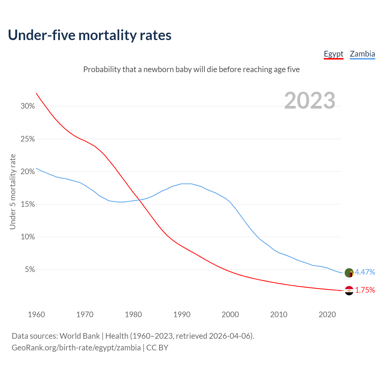 The chance that a newborn baby will die before reaching age five is 1.75% in Egypt and 4.47% in Zambia. Above is a chart with historical data on under-five mortality rates.