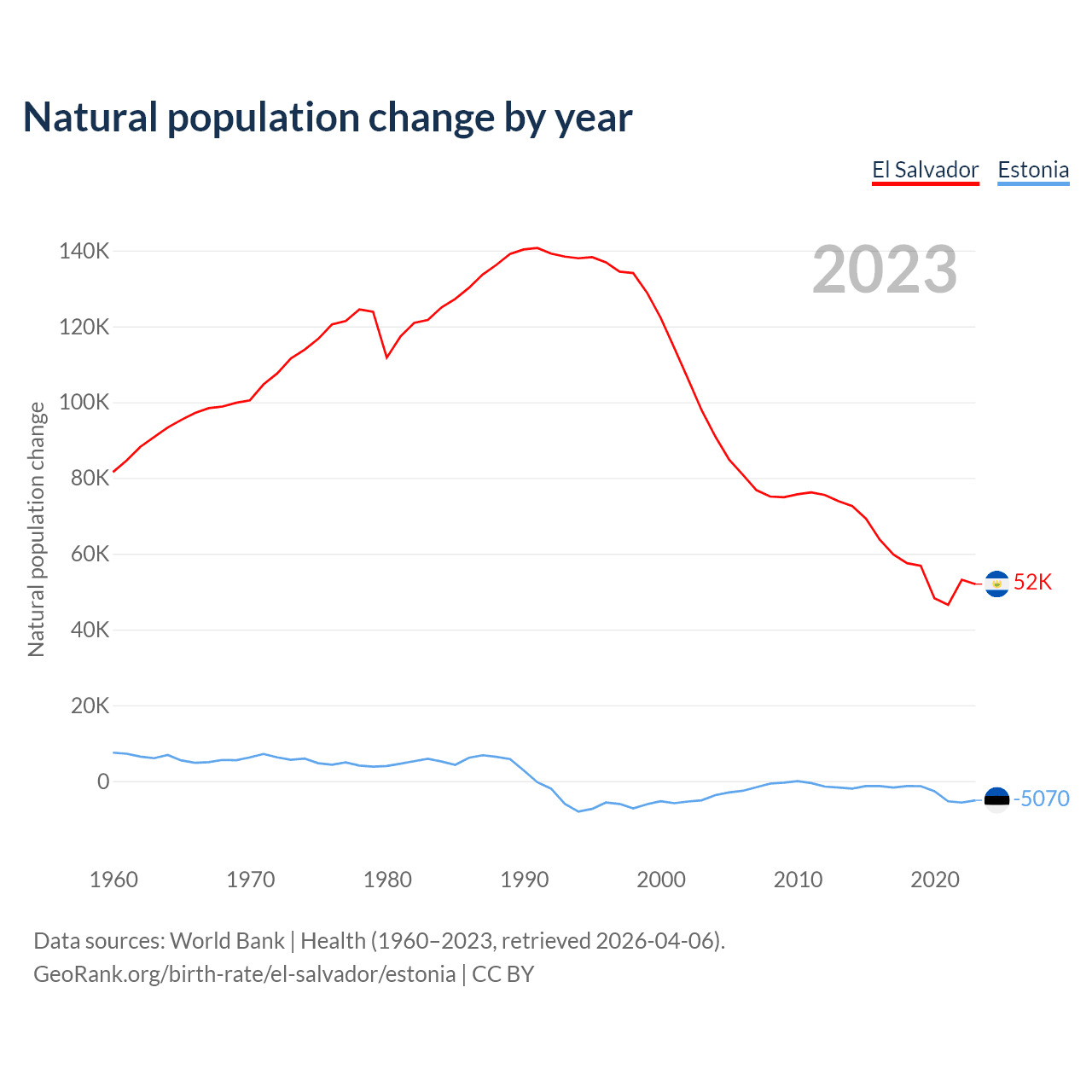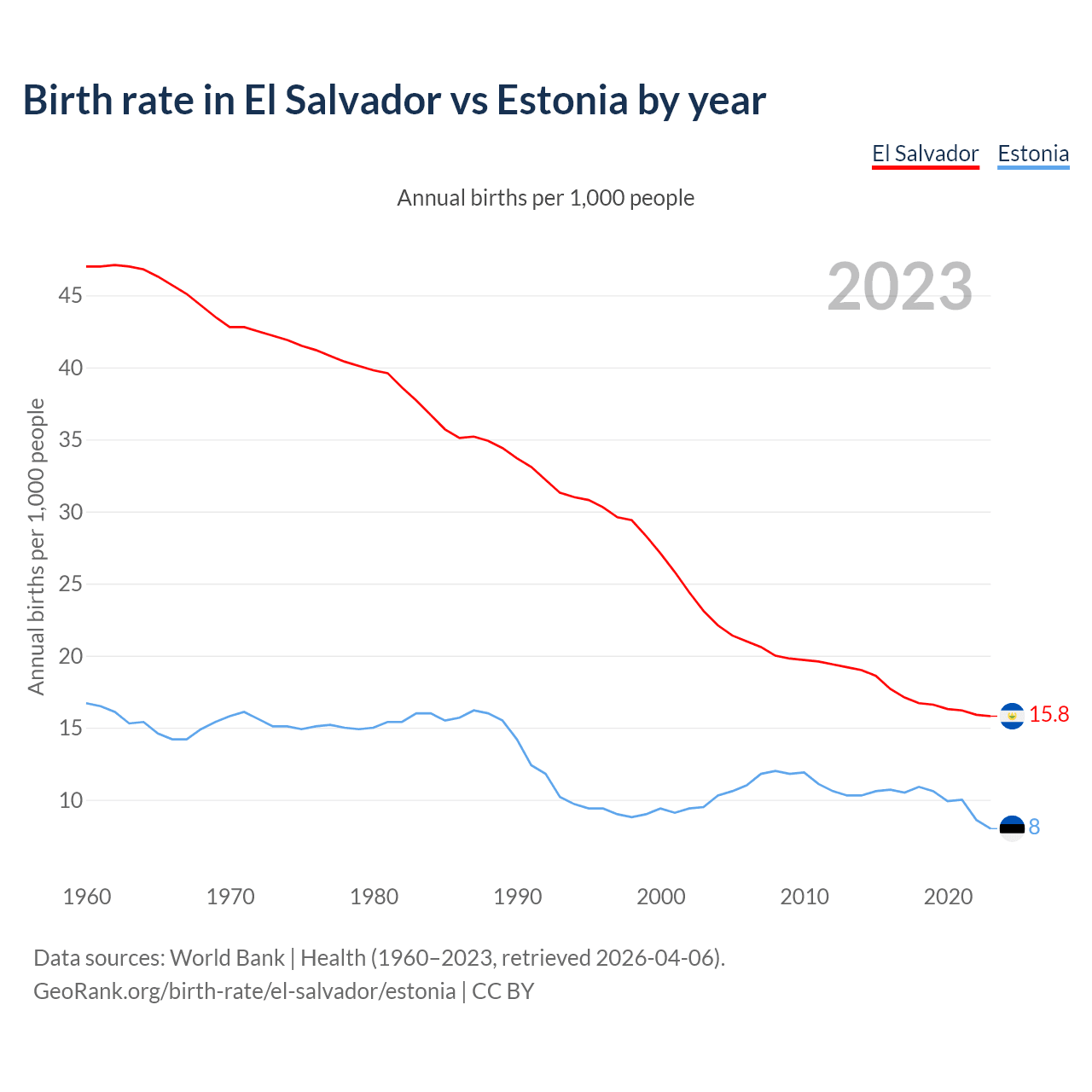 According to the latest available data on birth rates, the fertility rate in El Salvador was 1.78 children per woman in 2023, compared to 1.31 in Estonia in 2023. The replacement level is considered to be 2.1 children per woman.