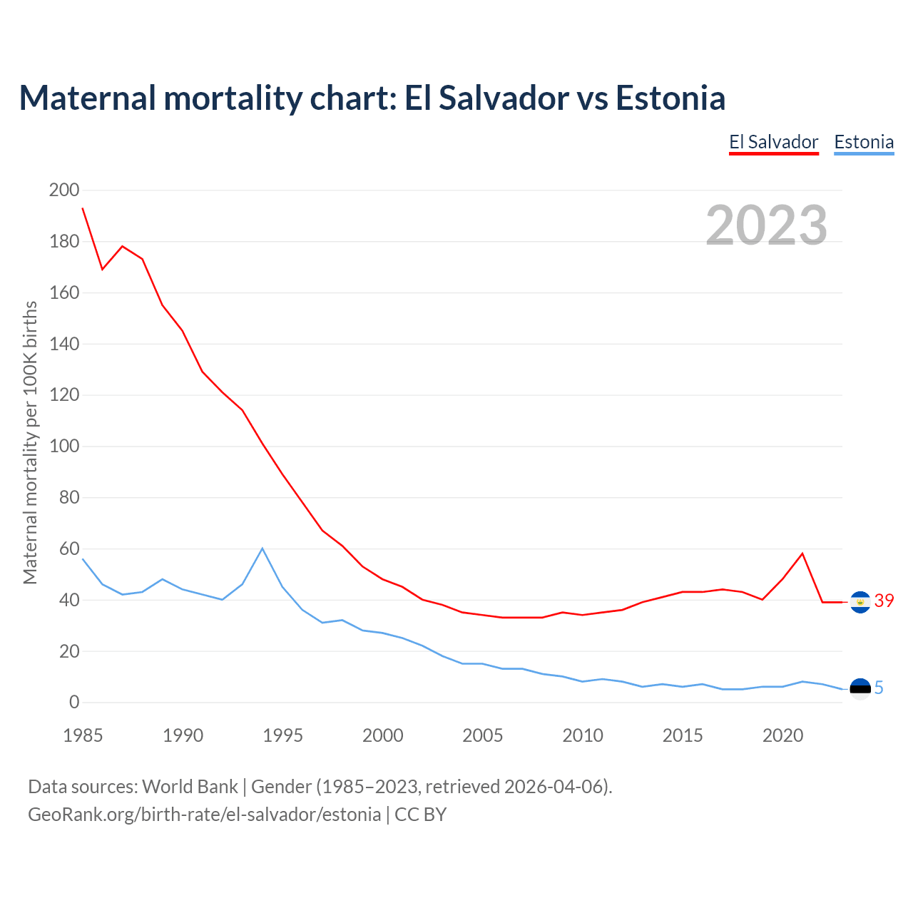 The maternal mortality rate, which is the probability of dying during childbirth or within 42 days of pregnancy termination, is 39 deaths per 100,000 live births in El Salvador, compared to 5 deaths in Estonia.