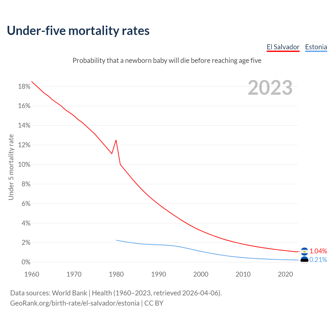 The chance that a newborn baby will die before reaching age five is 1.04% in El Salvador and 0.21% in Estonia. Above is a chart with historical data on under-five mortality rates.