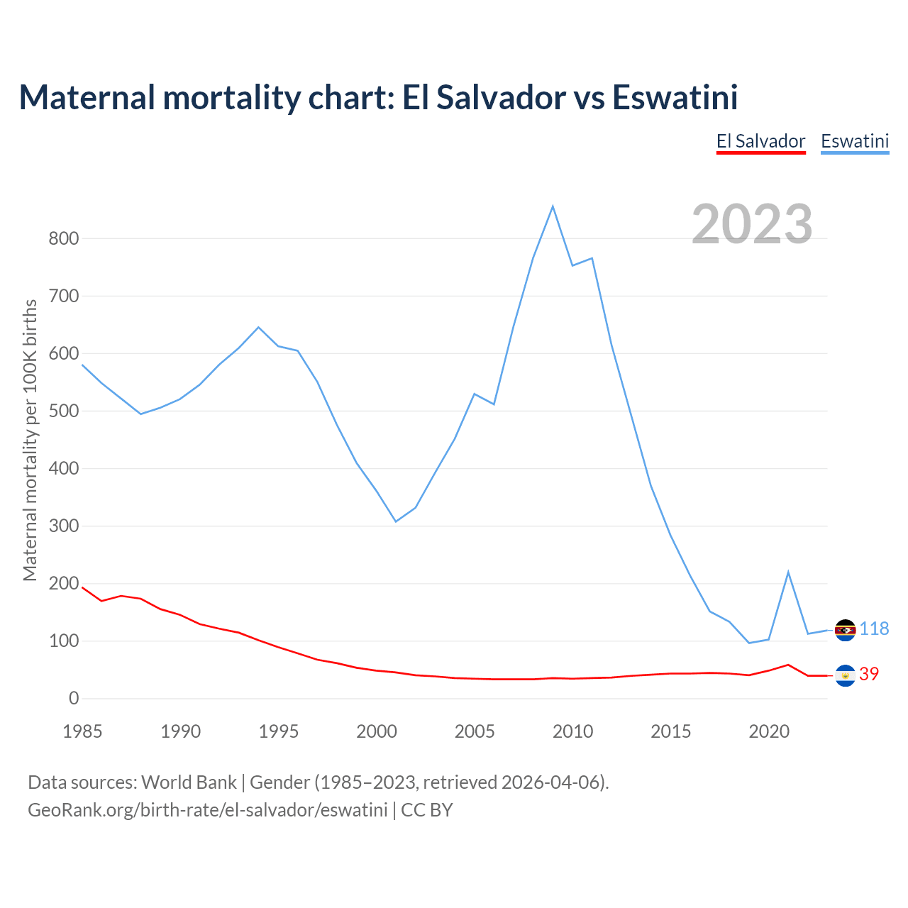 The maternal mortality rate, which is the probability of dying during childbirth or within 42 days of pregnancy termination, is 39 deaths per 100,000 live births in El Salvador, compared to 118 deaths in Eswatini.