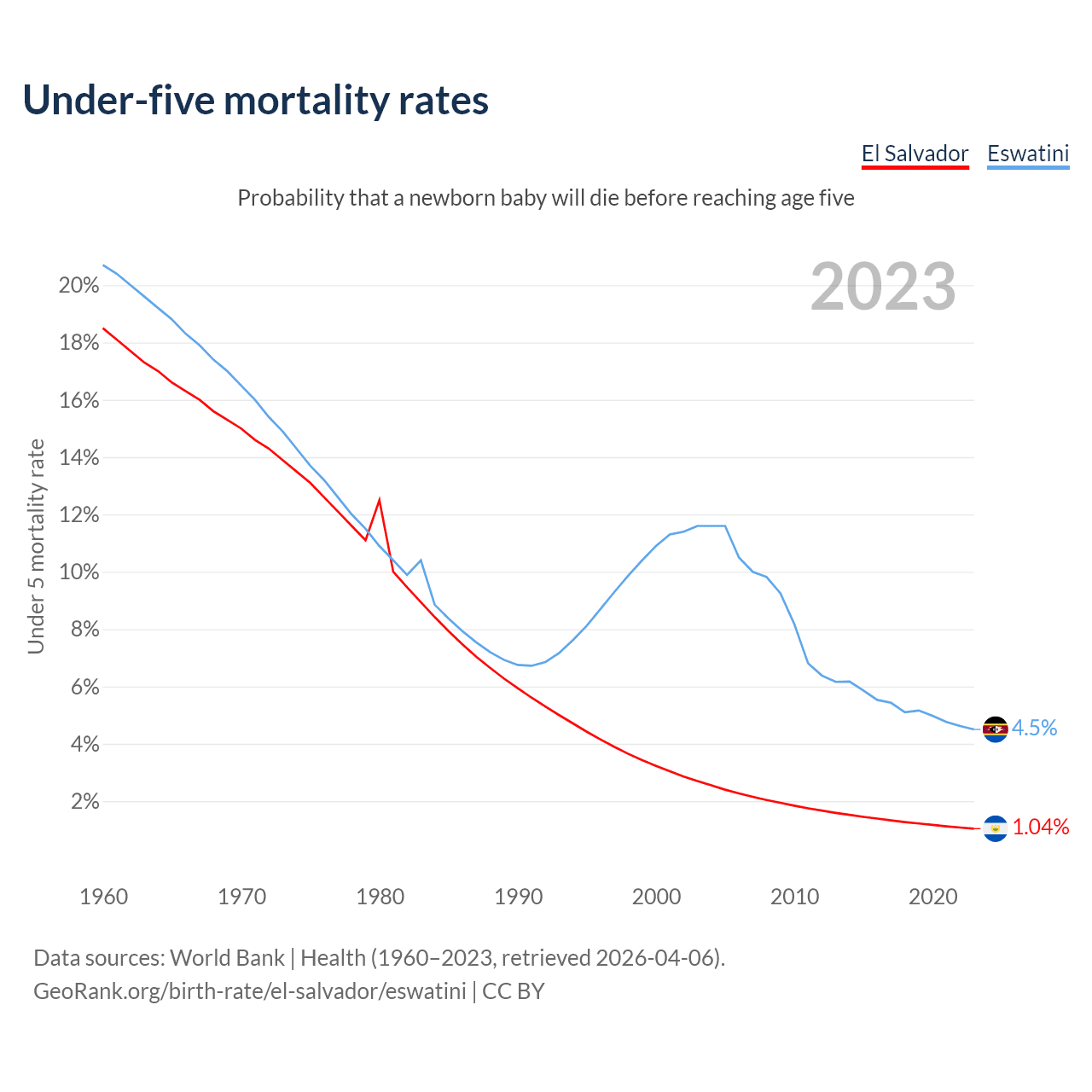 The chance that a newborn baby will die before reaching age five is 1.04% in El Salvador and 4.5% in Eswatini. Above is a chart with historical data on under-five mortality rates.
