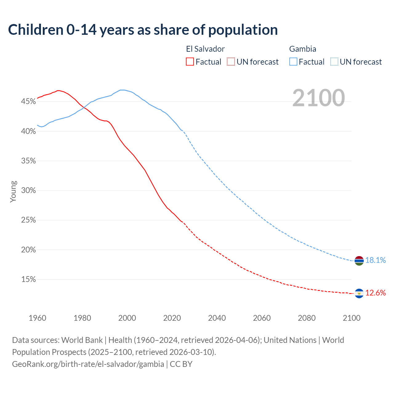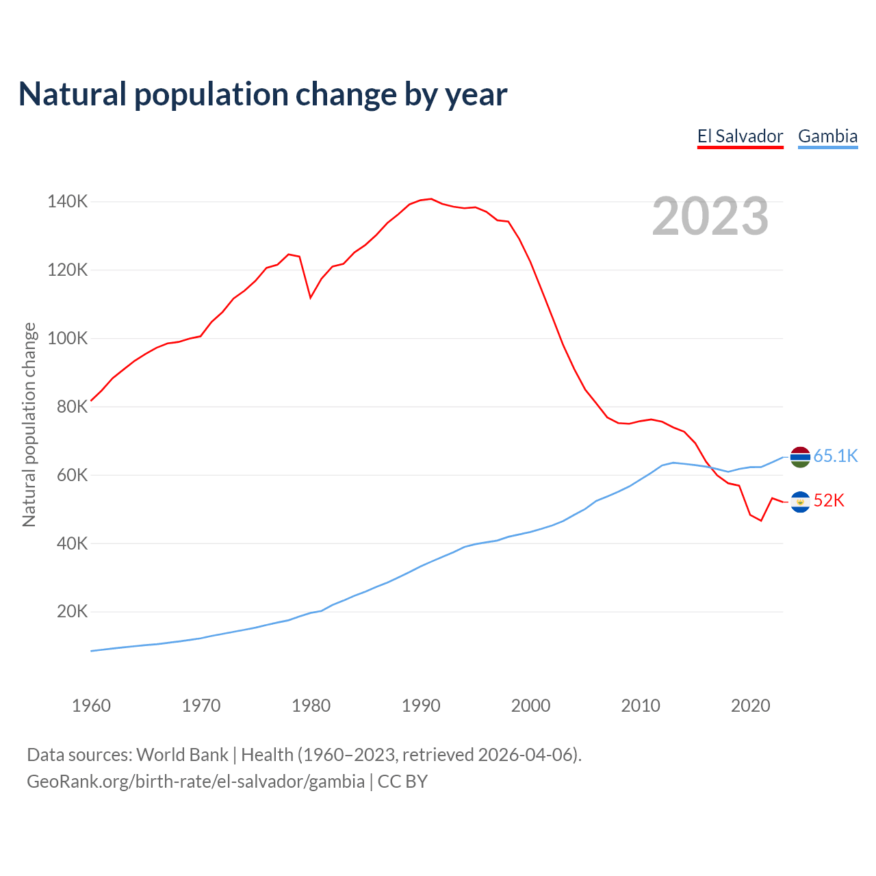 El Salvador has an annual birth rate of 15.8 births per 1,000 people, compared to 30.4 for the Gambia. The average number of children a woman is expected to have during her lifetime — the fertility rate, is 1.78 in El Salvador and 4.01 in the Gambia — 125.7% difference.