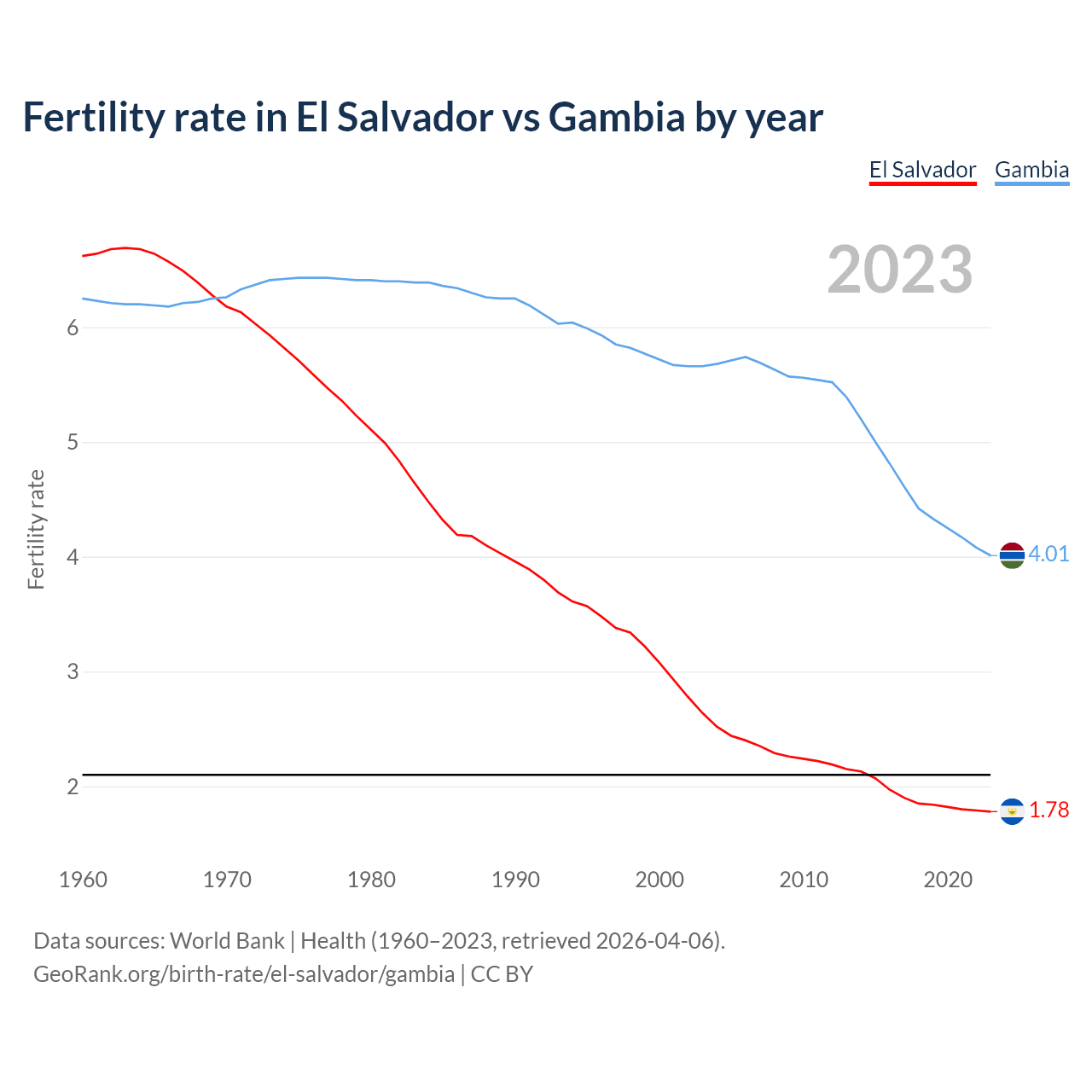 According to the latest available data on birth rates, the fertility rate in El Salvador was 1.78 children per woman in 2023, compared to 4.01 in the Gambia in 2023. The replacement level is considered to be 2.1 children per woman.