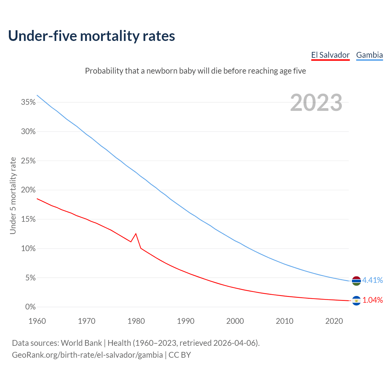 The chance that a newborn baby will die before reaching age five is 1.04% in El Salvador and 4.41% in the Gambia. Above is a chart with historical data on under-five mortality rates.