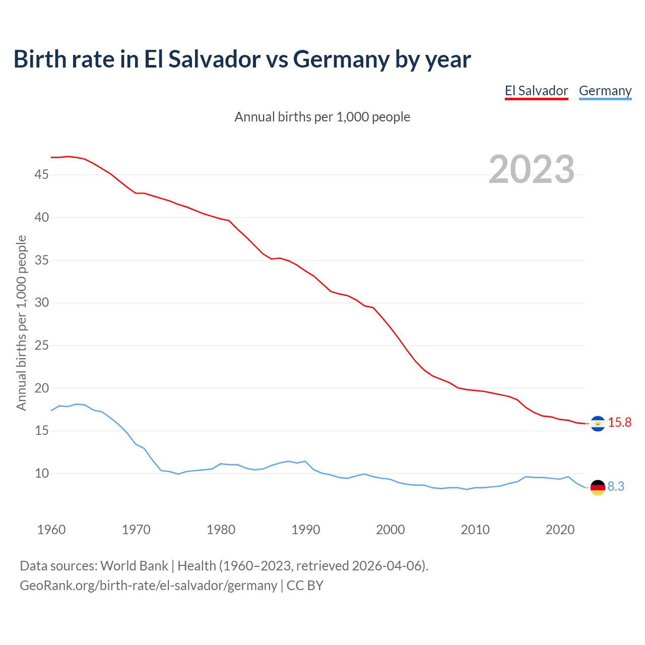 El Salvador has an annual birth rate of 15.8 births per 1,000 people, compared to 8.3 for Germany. The average number of children a woman is expected to have during her lifetime — the fertility rate, is 1.78 in El Salvador and 1.39 in Germany — 21.7% difference.