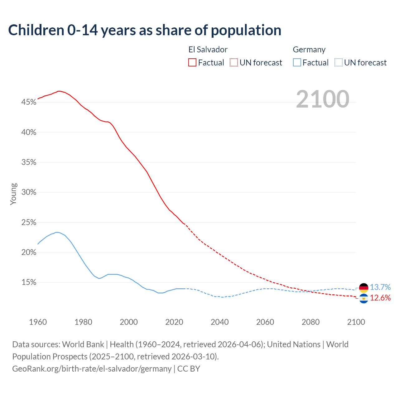 According to the latest available data on birth rates, the fertility rate in El Salvador was 1.78 children per woman in 2023, compared to 1.39 in Germany in 2023. The replacement level is considered to be 2.1 children per woman.