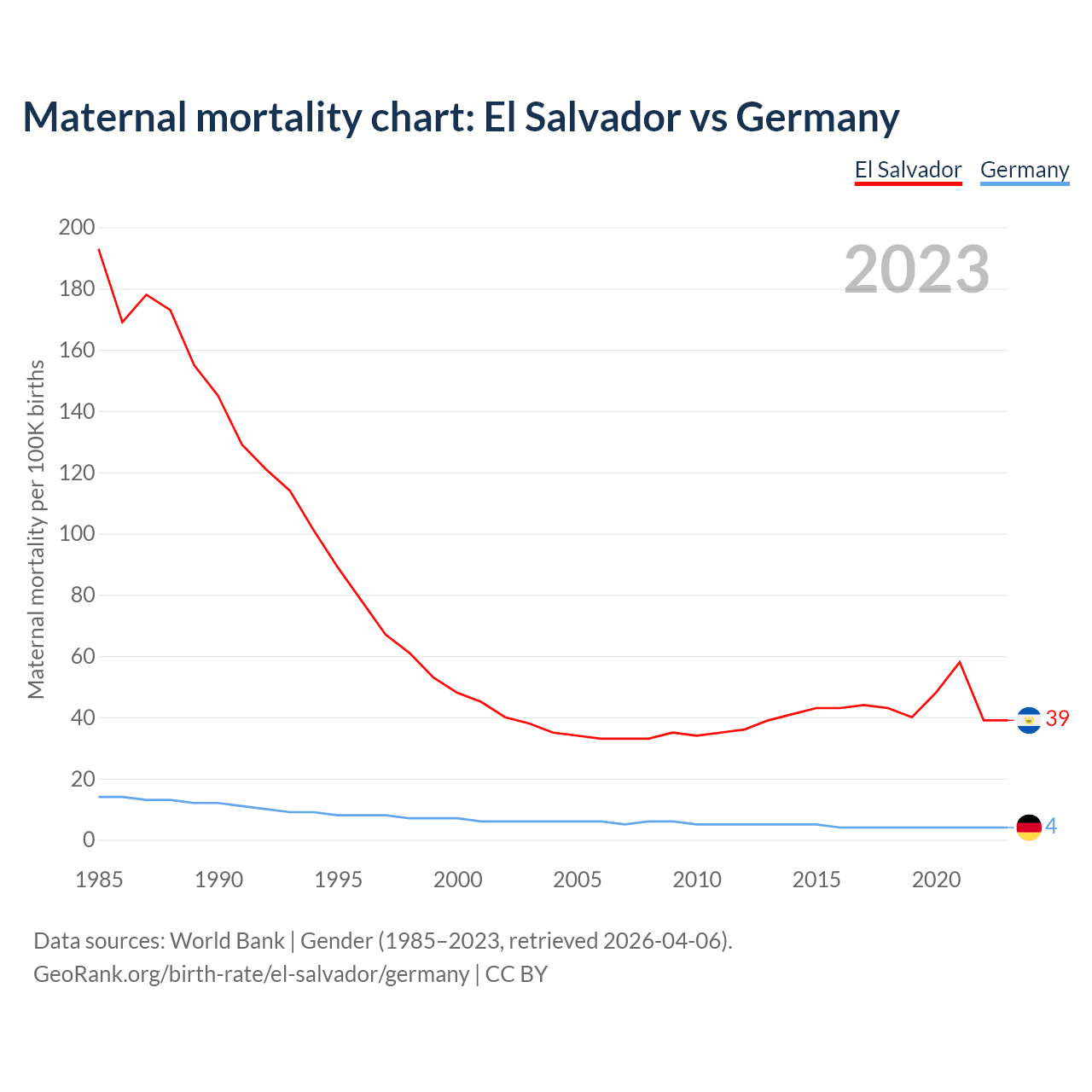 The maternal mortality rate, which is the probability of dying during childbirth or within 42 days of pregnancy termination, is 39 deaths per 100,000 live births in El Salvador, compared to 4 deaths in Germany.