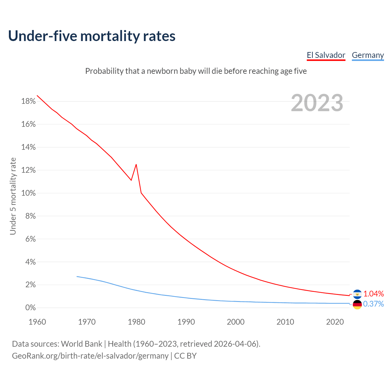 The chance that a newborn baby will die before reaching age five is 1.04% in El Salvador and 0.37% in Germany. Above is a chart with historical data on under-five mortality rates.
