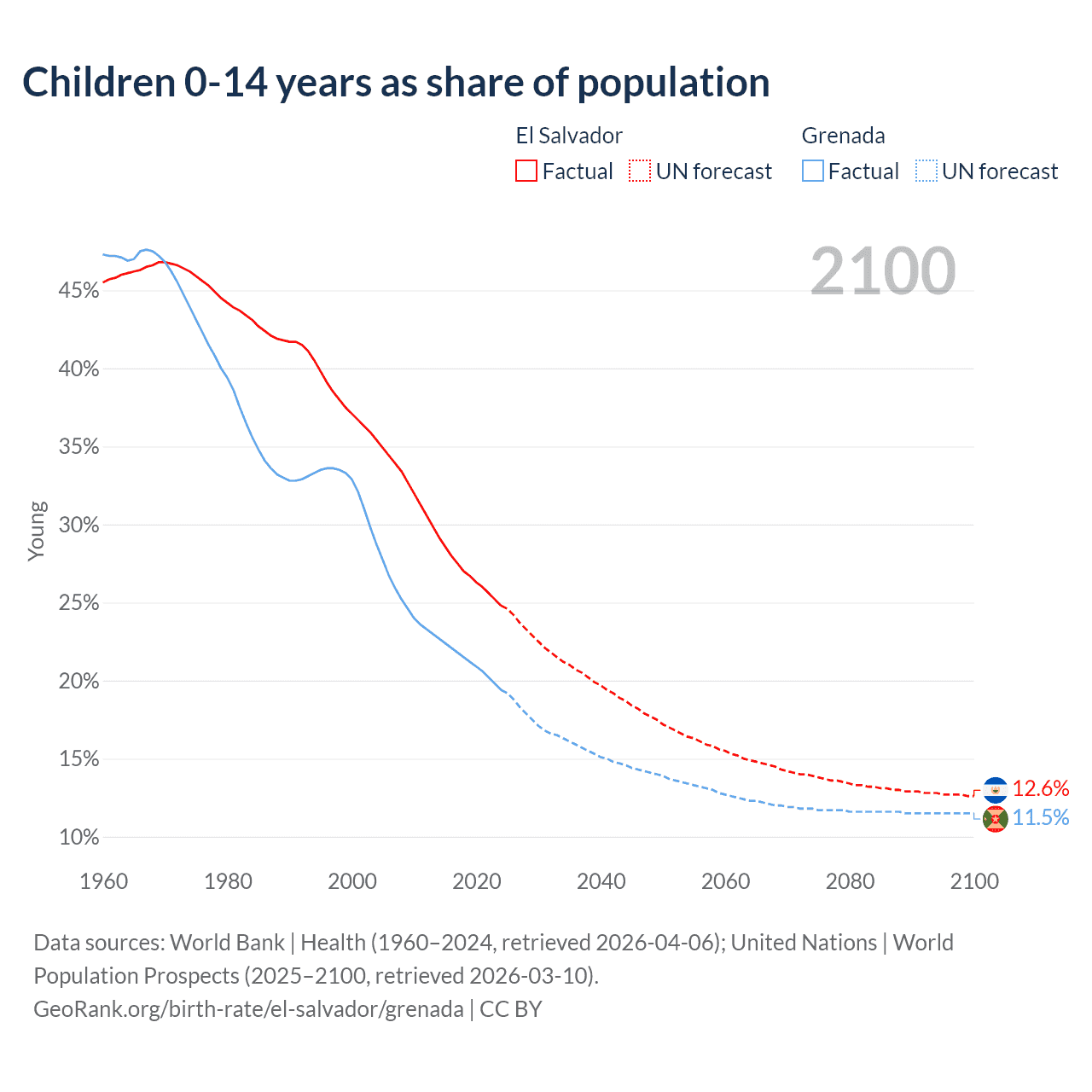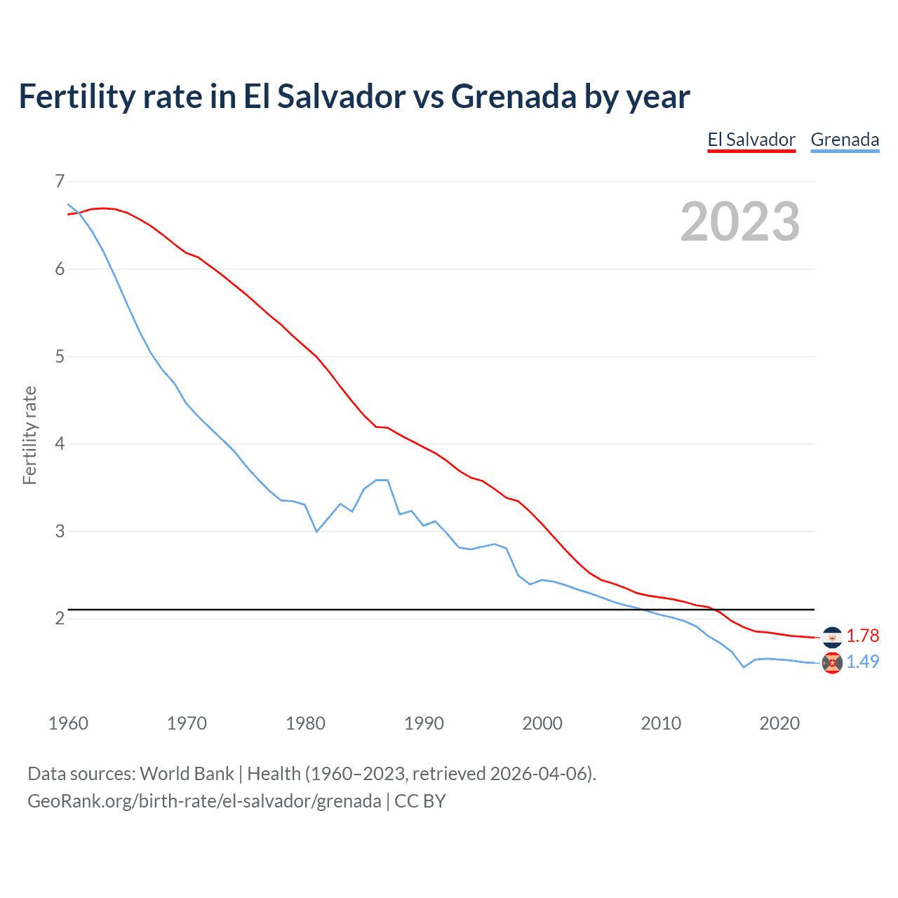 According to the latest available data on birth rates, the fertility rate in El Salvador was 1.78 children per woman in 2023, compared to 1.49 in Grenada in 2023. The replacement level is considered to be 2.1 children per woman.