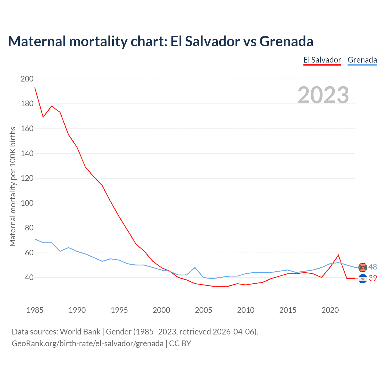 The maternal mortality rate, which is the probability of dying during childbirth or within 42 days of pregnancy termination, is 39 deaths per 100,000 live births in El Salvador, compared to 48 deaths in Grenada.